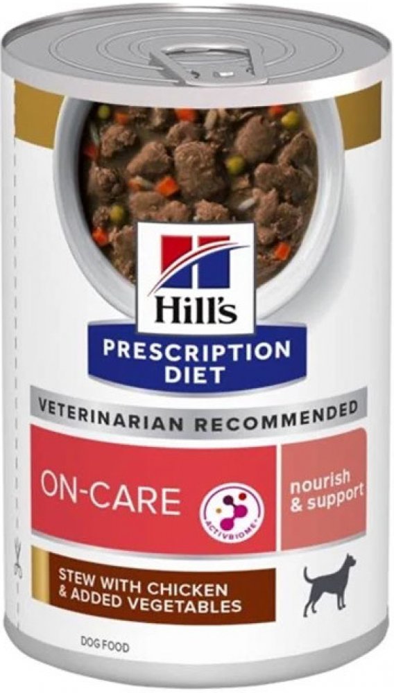 Hill’s Prescription Diet Canine ON Care 354 g - Hill's Prescription Diet ON-Care Stew s kuřetem a přidanou zeleninou pro psy je kompletní dietetické krmivo pro dospělé psy vyžadující nutriční podporu (při rekonvalescenci). - Pokud bylo u psa diagnostikováno závažné onemocnění, je důležité zajistit, aby byly splněny jeho nutriční potřeby. Prescription Diet ON-Care krmivo je sestaveno tak, aby pomáh...