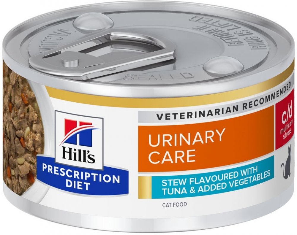Zakoupením vybraného veterinárního krmiva potvrzujete, že vaše zvíře bylo vyšetřeno veterinářem, který toto speciální veterinární krmivo doporučil na základě diagnózy, a že jste si přečetli a pochopili následující pokyny. Před podáváním tohoto krmiva svému zvířeti nebo před prodloužením doby podávání krmiva se poraďte s veterinářem. Pokud své zvíře krmíte tímto veterinárním krmivem, měli byste se o tom pravidelně (každých 6 měsíců) radit s veterinářem. Pokud se zdravotní stav vašeho zvířete zhorší, ihned se obraťte na veterináře. Vyvážený poměr životně důležitých živin je rozhodující pro zdraví močového měchýře. Přebytek minerálních látek může vést ke tvorbě močových krystalů, což může v konečném důsledku způsobit tvorbu močových kamenů. Ty mohou způsobovat nepohodlí a vážné problémy, které vyžadují veterinární léčbu. Krmivo pro kočky Hill's Prescription Diet c/d Multicare Stress ragú s tuňákem a zeleninou je klinickou výživou, která je zaměřena na podporu zdraví močových cest vaší kočky a zároveň podporuje emoční rovnováhu. Je klinicky prokázáno, že toto vlhké krmivo může snížit frekvenci opakovaného výskytu nejčastějších příznaků v močových cestách. Toto neodolatelné ragú je lahodným receptem z tuňáka a zeleniny a vaše kočka si jeho chuť jednoduše zamiluje. Krmivo Hill's Prescription Diet c/d Multicare Stress ragú s tuňákem a zeleninou je vyrobeno z vysoce kvalitních surovin, které splňují přísné požadavky na čistotu a obsah živin. Hill's Prescription Diet c/d Multicare Stress ragú s tuňákem a zeleninou: Kompletní dietní krmivo ke snížení opakovaného výskytu struvitových kamenů (příčina onemocnění dolních močových cest u koček, FLUTD), k rozpouštění struvitových kamenů a ke snížení tvorby oxalátových kamenů u dospělých koček L-tryptofan a hydrolyzát mléčné bílkoviny: na podporu emoční rovnováhy Tuňák a zelenina: neodolatelná chuť Nenasycuje moč, co se týče struvitů Alkalizuje moč Nižší obsah hořčíku, vápníku a vitamínu D Doporučují veterináři