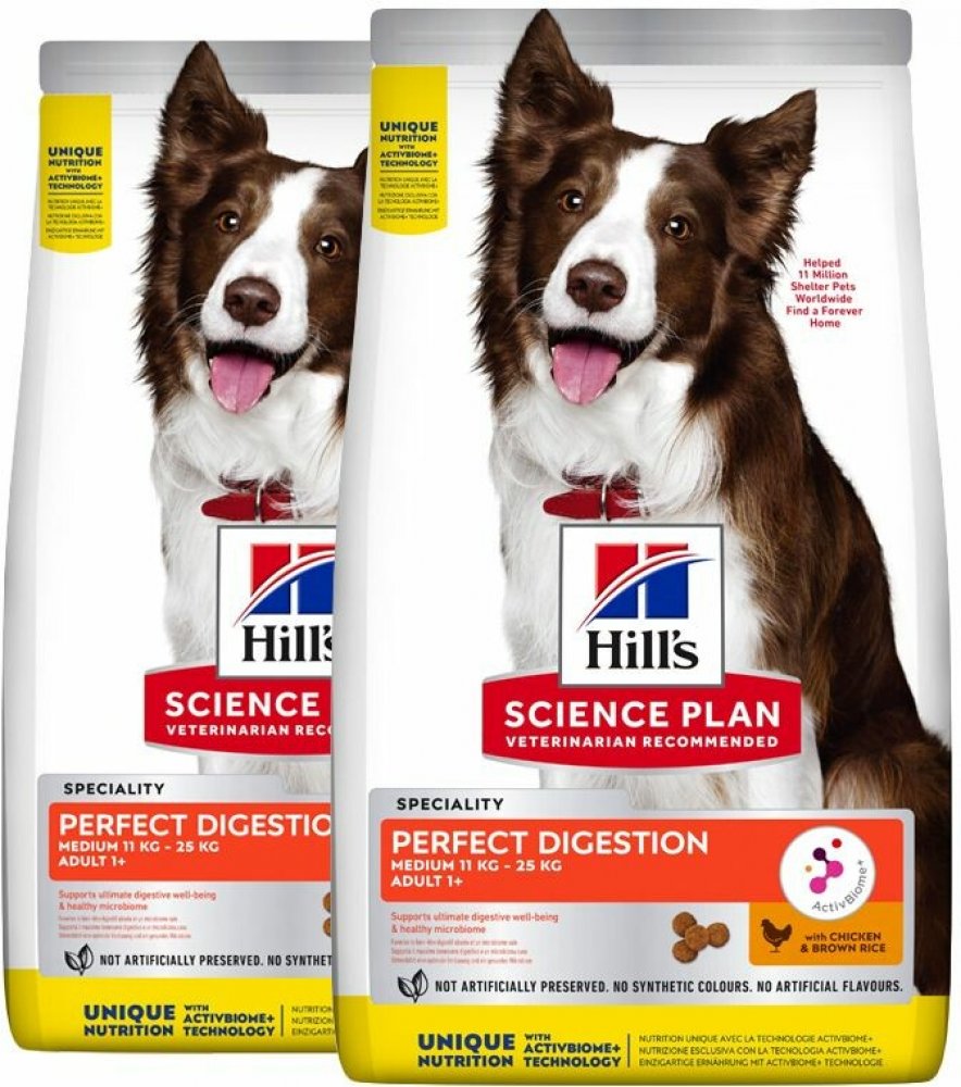 Zdravé trávení a pravidelné vyprazdňování jsou důležité pro celkovou pohodu Vašeho psa. Krmivo Hills Science Plan Adult Perfect Digestion Medium Breed je speciálně vyvinuto tak, aby podporovalo funkci trávicího traktu a optimalizovalo vstřebávání živin v těle. Granule jsou velmi chutné a jsou dobře přijímány mnoha čtyřnohými přáteli. Krmivo pro psy je vyrobeno z lehce stravitelných surovin, jako jsou lahodné kuřecí maso a hnědá rýže. Krmivo dodává psovi vysoce kvalitní bílkoviny, které pomáhají udržovat svalovou hmotu. Krmivo Hills Science Plan Adult Perfect Digestion Medium Breed navíc obsahuje směs prebiotických vláken, které podporují vyváženou střevní flóru a optimální trávení. Prebiotika navíc přispívají ke zdravému vyprazdňování. Krmivo neobsahuje umělá barviva, příchutě a konzervační látky a je vhodné pro každodenní výživu Vašeho domácího mazlíčka. Hills Science Plan Adult Perfect Digestion Medium Breed: Prémiové kompletní suché krmivo pro dospělé psy středně velkých plemen (11-25 kg) Směs prebiotických vláken Složení "ActivBiome+" s prebiotiky pro podporu normálního trávení. Regulované trávení Může podporovat optimální vstřebávání živin a zdravé a pravidelné vyprazdňování. Receptura bohatá na vitální látky S antioxidanty, jako jsou vitamíny C a E, které mohou podpořit imunitní systém. Zdroj vysoce kvalitních bílkovin Důležité pro zachování svalové hmoty. Snadno stravitelné: připravené z lehce stravitelných surovin, jako jsou kuřecí maso a hnědá rýže Doporučené veterináři Dobrá chuť: velmi dobře přijímáno mnoha psy Bez umělých barviv, aromat a konzervantů