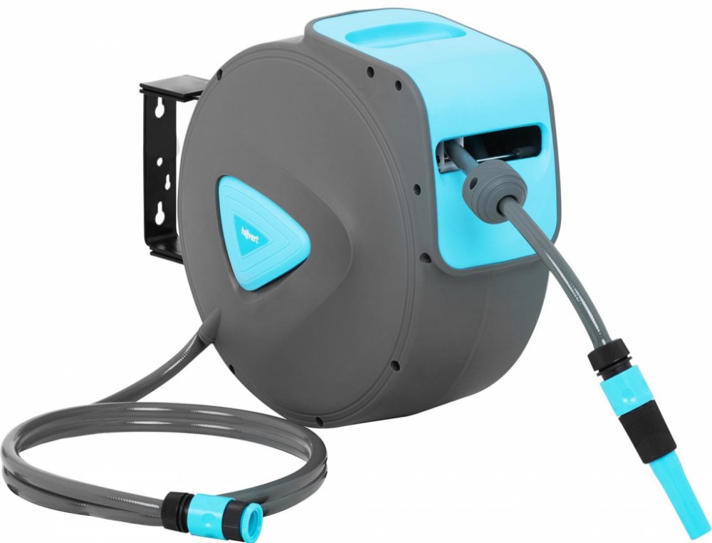 Automatický naviják s hadicí 20 + 2 m, flexibilita díky hadicovému navijáku otočnému o 180°, automatický naviják zajišťuje pořádek, snadná instalace – montážní příslušenství součástí dodávky, snadné skladování