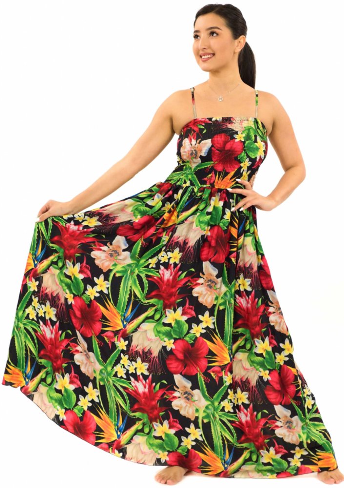 Himalife Dlouhé šaty s kapsami Tropické květy černá smi