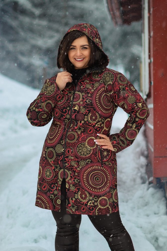 Připravte se na chladné počasí a rozzařte městskou šeď barvami přímo z Nepálu! S naším zatepleným kabátkem Hiva vás nikdo nepřehlédne. Je posetý nádherným potiskem ornamentů a mandal, šitý z pevné a silné bavlny a uvnitř je teploučký fleece.