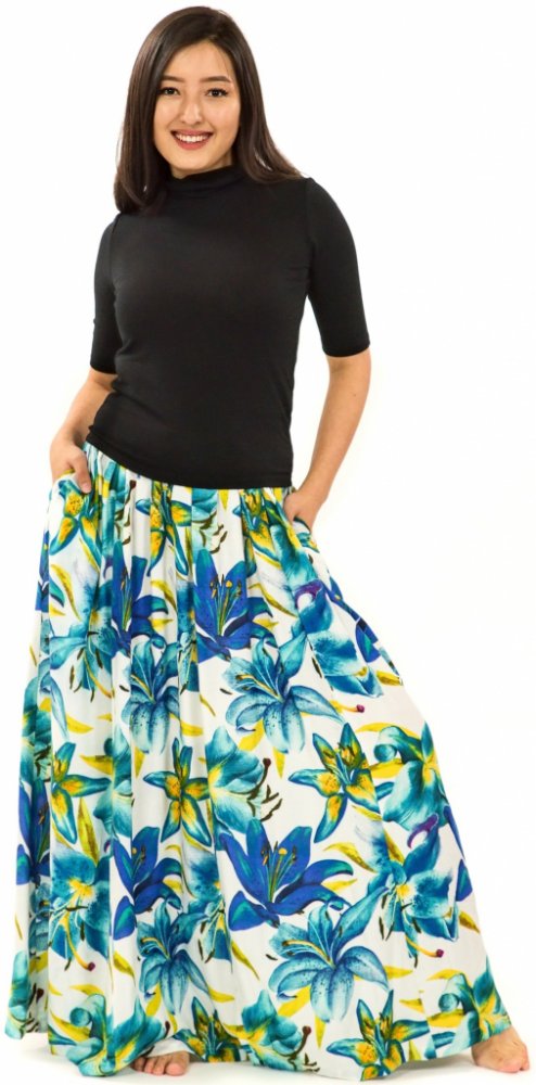 Himalife maxi sukně s kapsami Lilie bílá s tyrkysovou