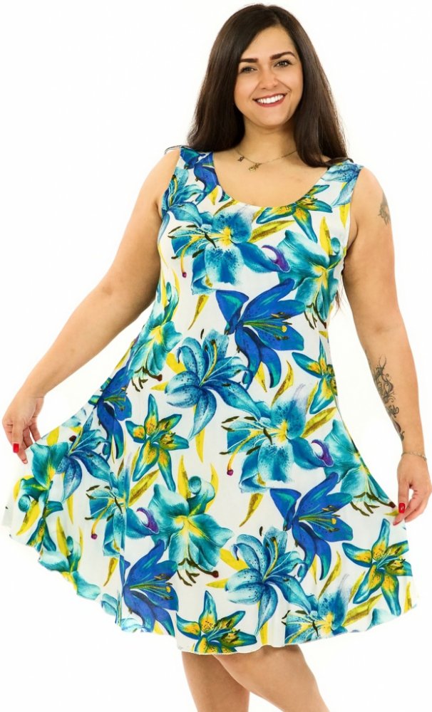 Originální letní šaty z lehkého a příjemného viskózového hedvábí se chlubí nádhernými sytými barvami a překrásným vzorem. Šaty na ramínka naše švadlenky ušily v širokém střihu do A, který nejenže vypadá skvěle na každé ženě, ale je také velmi pohodlný. Šaty jsou navíc doplněny o dvě boční kapsy.