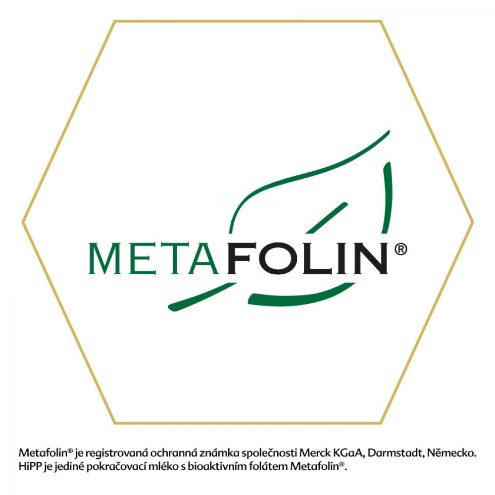 (2) Metafolin je registrovaná ochranná známka společnosti Merck KGaA, Darmstadt, Německo. HiPP je jediné pokračovací mléko s bioaktivním folátem Metafolin.