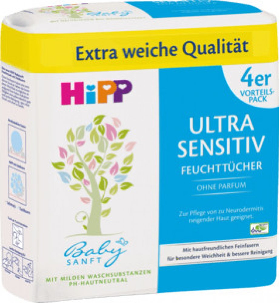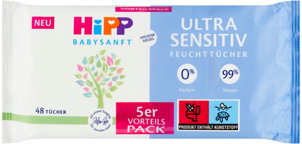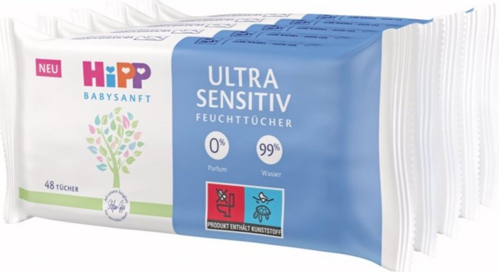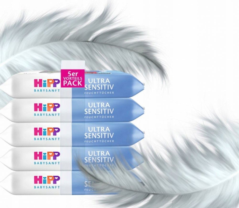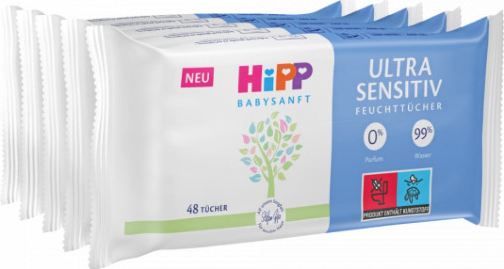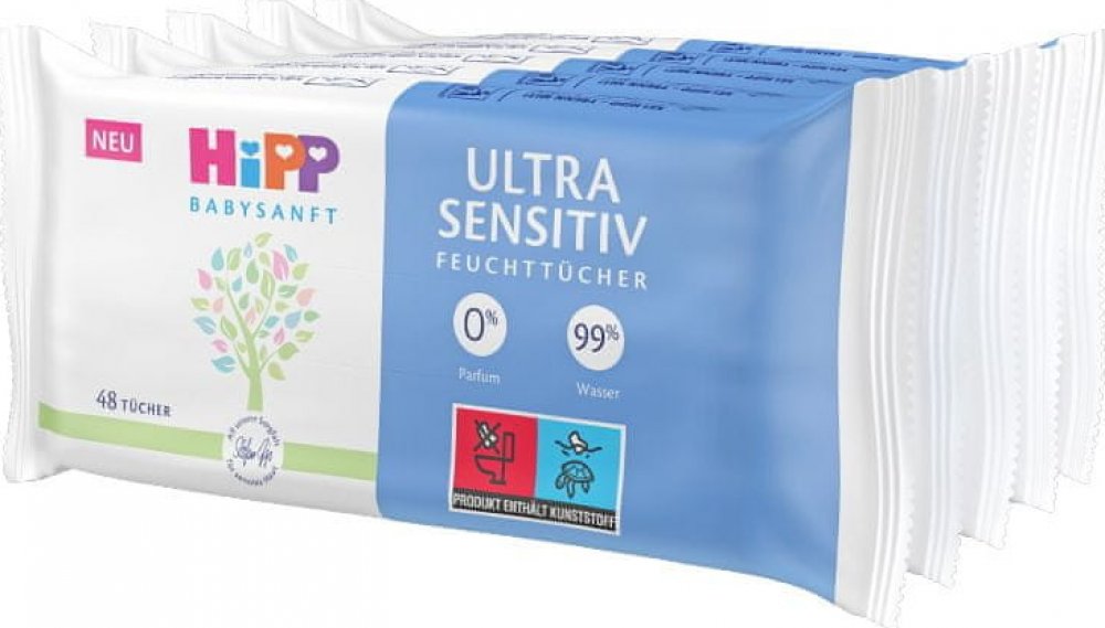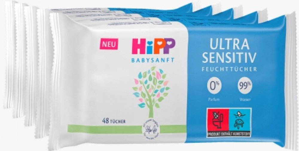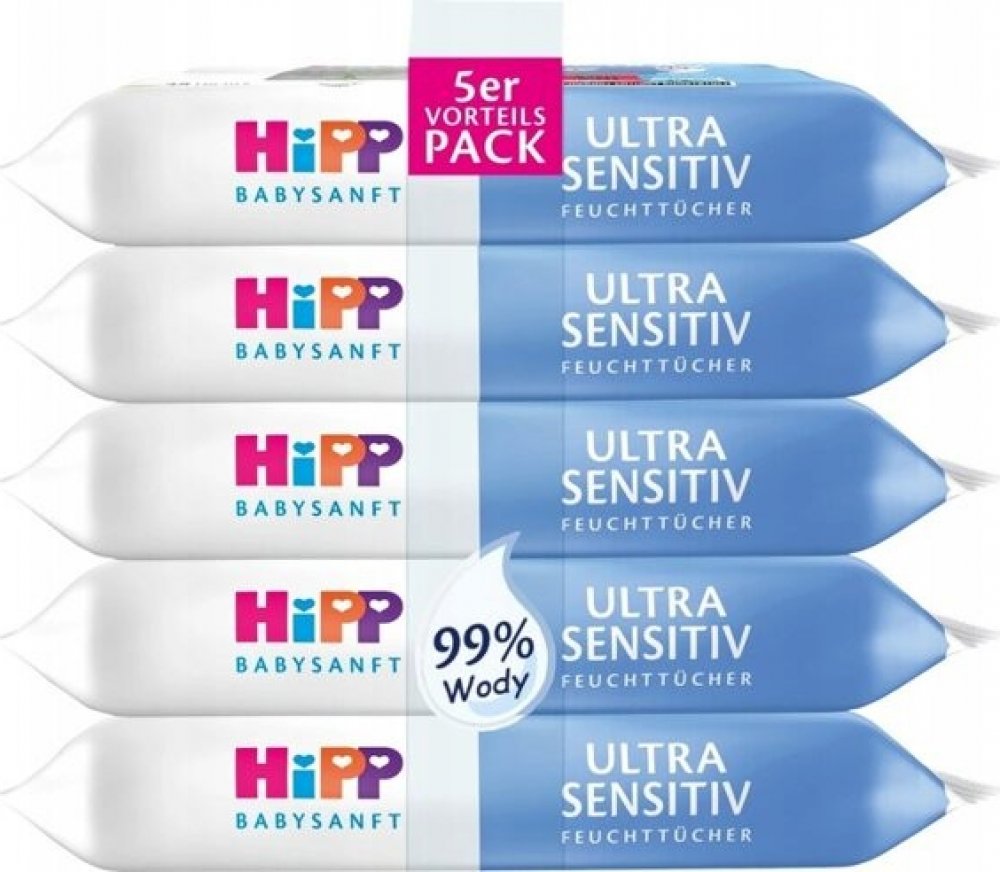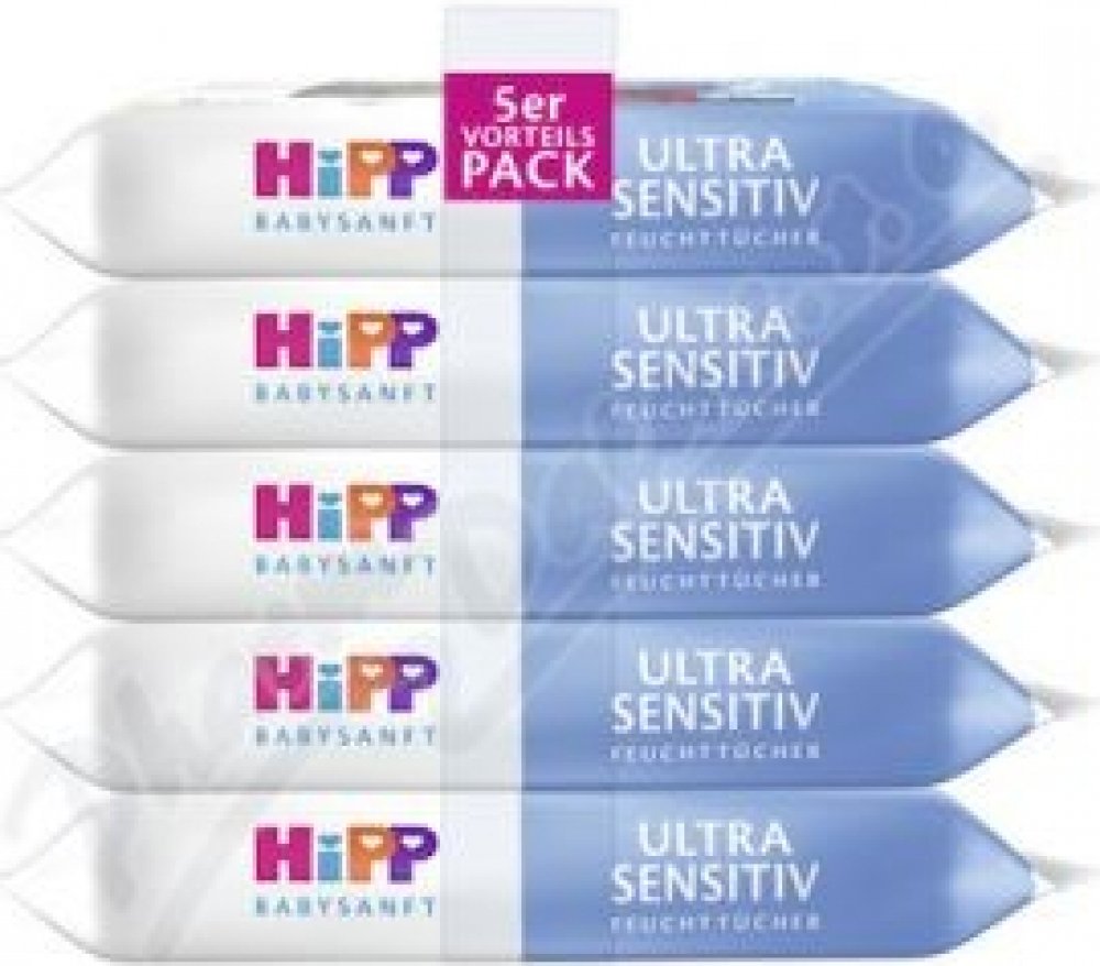 Dětské vlhčené ubrousky HiPP ULTRA SENSITIV mají obzvláště jemná vlákna s vysokou absorpční schopností pro něžné očištění pokožky miminka již od narození. Ubrousky jsou napuštěny jemným pleťovým mlékem s obsahem 99 % vody a 0 % parfému. Díky tomu jsou vhodné pro šetrné očištění citlivé pokožky i pokožky se sklonem k alergiím (atopické dermatitidě). Vyhovují nejen na zadeček, ale i na obličej a ruč...