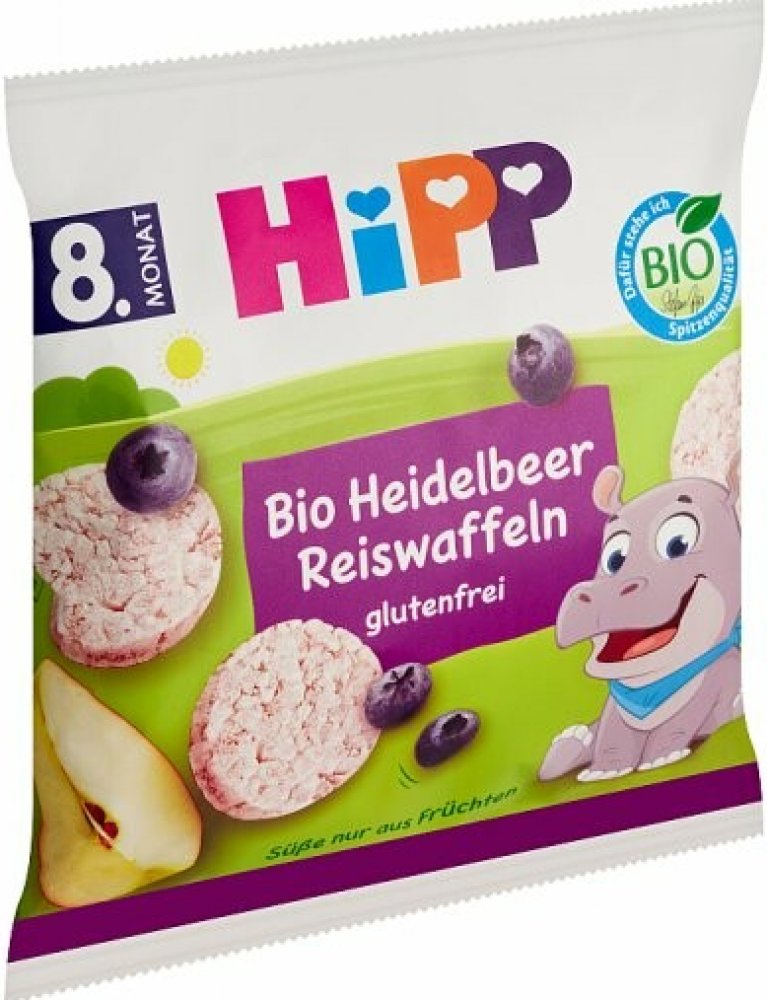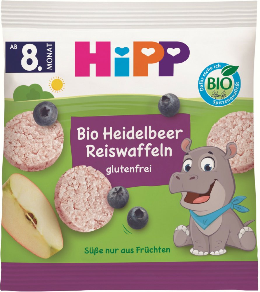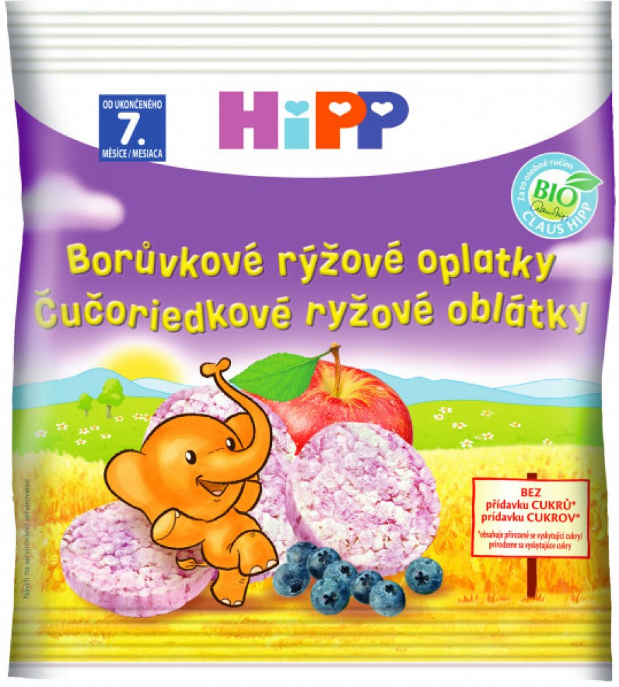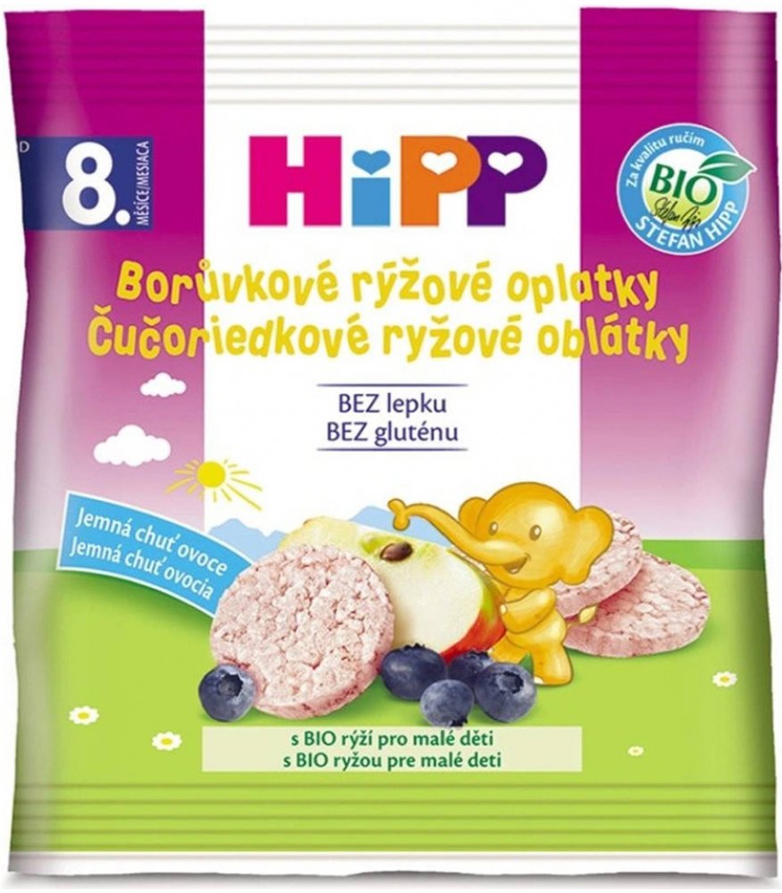 Lahodně ovocná svačinka. HiPP Borůvkové rýžové oplatky jsou vyrobeny z pufované BIO rýže a obsahují navíc BIO jablečnou šťávu a BIO borůvkové pyré. Jsou přirozeně jemné a zároveň mají lahodnou ovocnou příchuť. Jsou lehce stravitelné a zcela bez přídavku cukrů – jemně sladkou příchuť dodává BIO jablečná šťáva. Malý kulatý tvar je ideální pro dětské ruce – doma stejně jako na cestách.