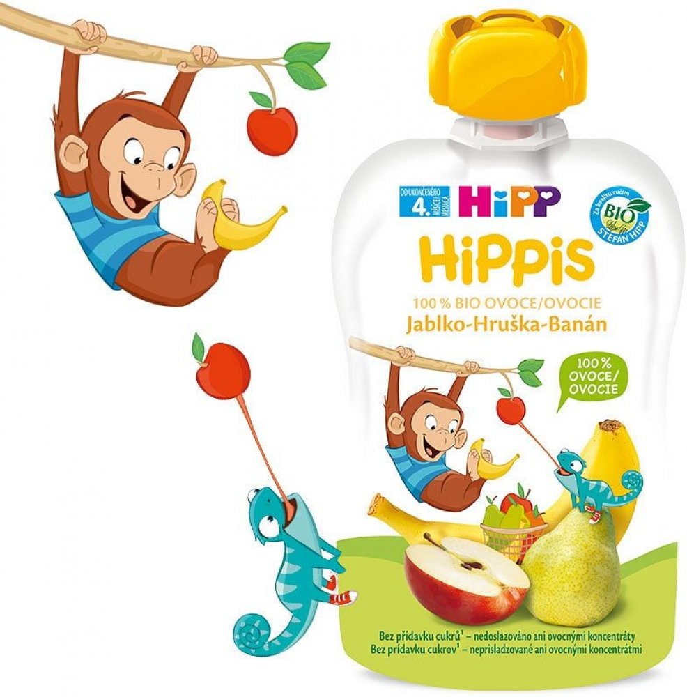 Víte, jak plníme naše kapsičky ovocem? Přeci za pomoci HiPPis zvířátek. Opička Žofka podává ovoce z těch nejvyšších větví chameleonovi Pájovi, který ho svým dlouhatánským jazykem opatrně ukládá do košíku.