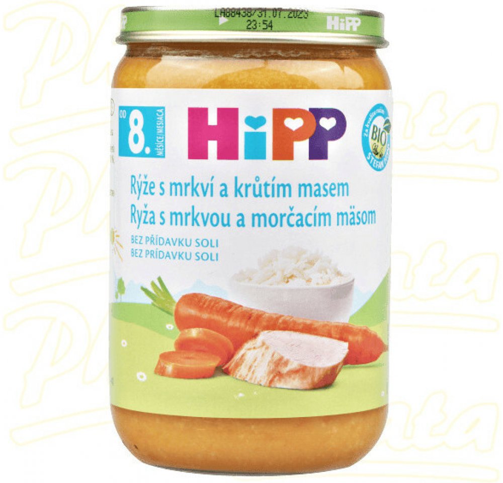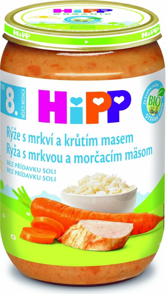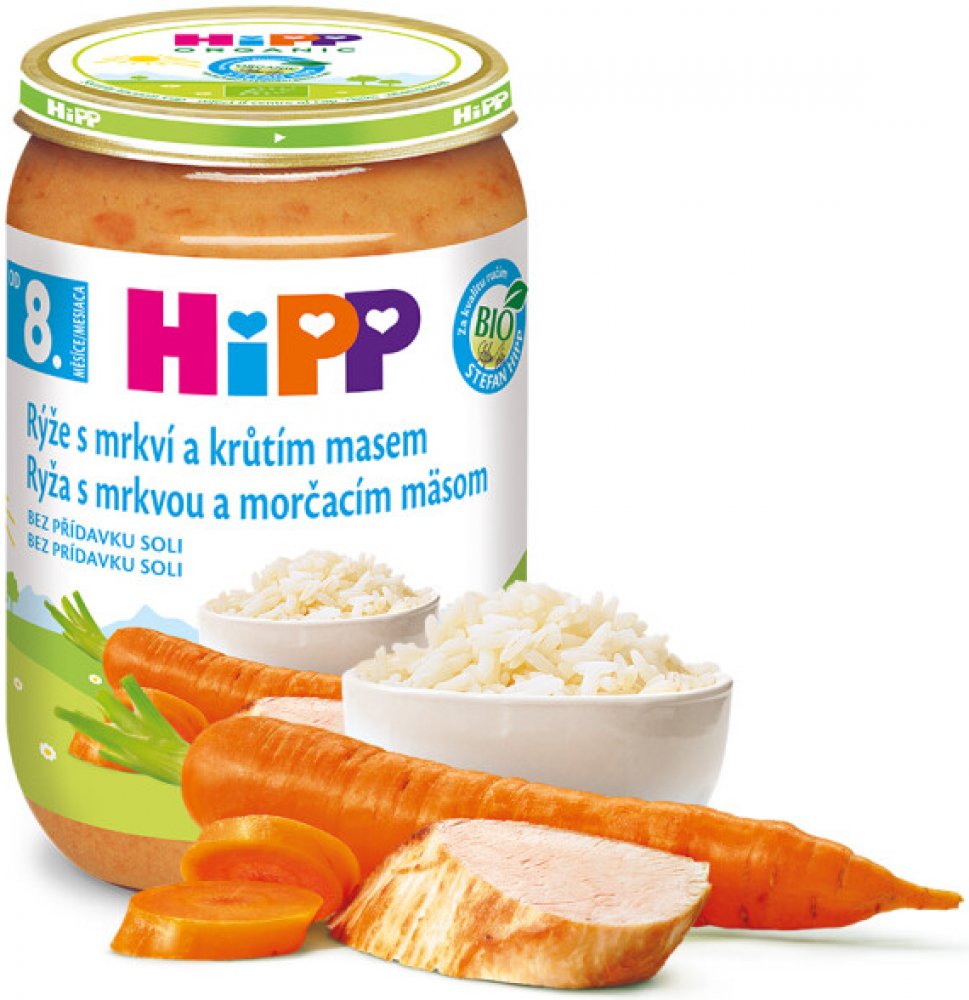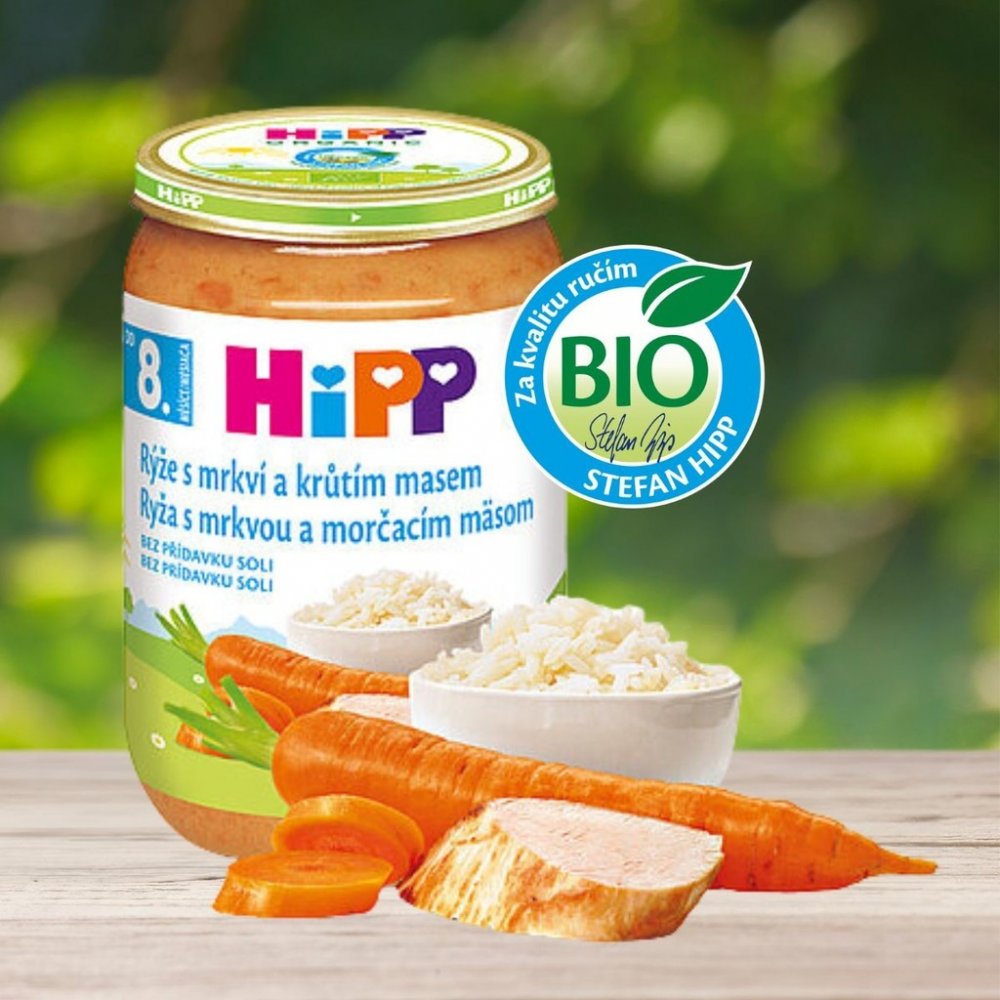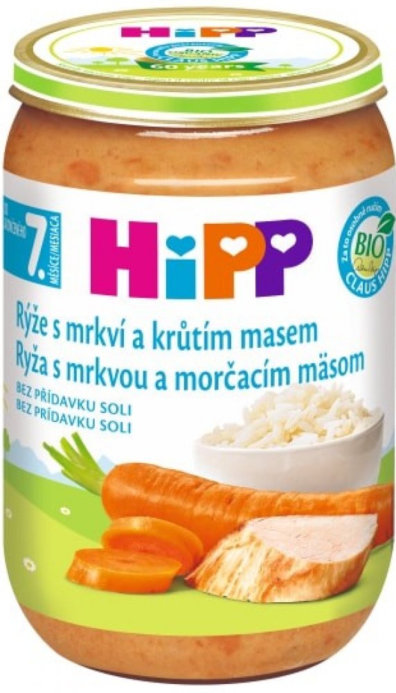 HiPP 220 g mrkvové s rýží a krůtím masem 7. měsíce masozeleninové HiPP ve sklenici