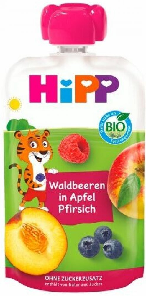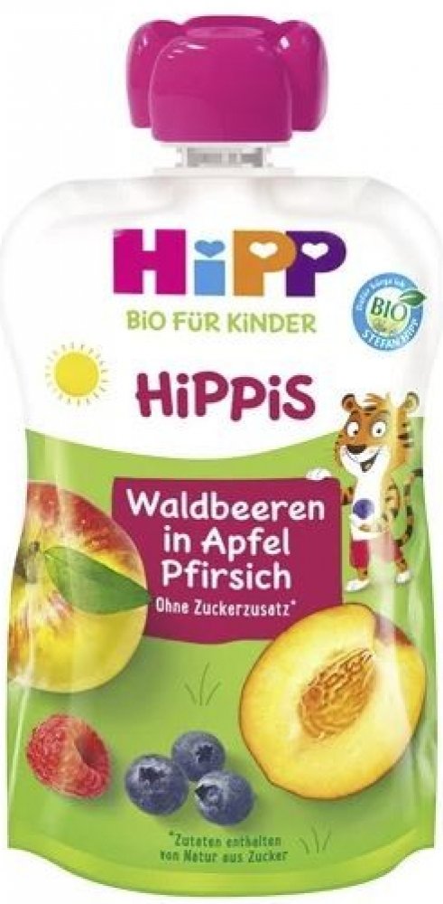 HIPP Hippis BIO Lesní plody, Jablko, Broskev 100g Víte, jak plníme naše kapsičky ovocem? Přeci za pomoci HiPPis zvířátek. Opička Žofka podává ovoce z těch nejvyšších větví chameleonovi Pájovi, který ho svým dlouhatánským jazykem opatrně ukládá do košíku. HiPPiS ovocné kapsičky jsou bez přidaného cukru a nejsou doslazovány ani ovocnými koncentráty. Jsou vyrobeny z ovoce té nejvyšší BIO kvality. Vlastnosti:100 % ovoceBez přídavku cukrů (obsahuje přirozeně se vyskytující cukry)Nedoslazováno ovocnými koncentrátyPřirozeně bez lepkuJemné pyréBIOPodle věku dítěte je možné kapsičku podávat třeba na lžičce nebo talířku. Kapsička se skladuje v suchu a temnu při teplotě do 24 deg;C. Složení: Ovoce * 100% (jablka * 73%, broskve * 16%, lesní plody * 11% (borůvky *, maliny *)). * Z ekologické produkce Průměrné nutriční hodnoty na 100 g:Energie 208 kJEnergie 49 kcalTuk 0,1 gTuk, z toho nasycené mastné kyseliny 0 gSacharidy 10,8 gSacharidy, z toho 10,2 g cukruBílkoviny 0,4 gSůl lt;0,05 gSodík lt;0,02 g