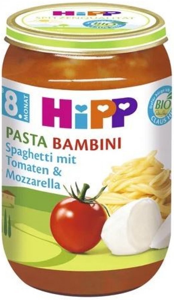 HiPP BIO Rajčata se špagetami a mozzarelou, od 8. měsíce 220 g Bezmasý zeleninový příkrm HiPP BIO Rajčata se špagetami a mozzarellou obsahuje drobné kousky pro učení se žvýkat a je vhodný pro děti od ukončeného 7. měsíce. Obsahuje lepek. V BIO kvalitě.