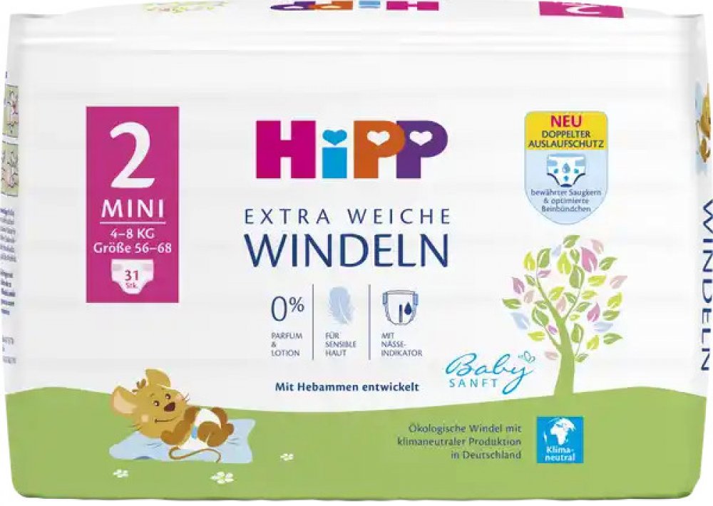 HiPP Babysanft extra měkké plenky, velikost 2 (Mini, 4-8 kg):Protože citlivá pokožka potřebuje zvláště měkké plenky, nové HiPP Babysanft Extra Soft plenky nejen udržují vaše dítě v suchu a suchu, ale jsou také velmi laskavé k pokožce. Takže váš miláček je zabalen jemně a sucho ve dne i v noci. Vyvinuto s porodní asistentky, aby se minimalizovalo riziko alergie od začátku. Proto jsou plenky HiPP Babysanft bez parfému, pleťového mléka, chloru (TCF) a přírodního latexu. S inovativním zapínáním: háčky ze síťoviny ulpívají na povrchu pleny v libovolném bodě pro flexibilní přizpůsobení nohám a bříšku. S indikátorem vlhkosti, výstřihem z pupeční ochrany a dlouhým absorpčním jádrem pro optimální suchost. Kompatibilita klinicky dermatologicky testována.Šetrné k životnímu prostředí a šetrné k životnímu prostředí: buničina ze 100 udržitelných zdrojů. Plenky vyrobené ze zelené elektřiny. Krátké dopravní trasy, vyrobené v Německu.udržuje vás v suchu - ve dne iv nocis inovativním fit uzávěrem pro flexibilní přizpůsobení no