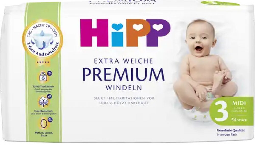 HiPP Babysanft extra měkké plenky Velikost 3 (Midi, 6-10 kg):Protože citlivá pokožka potřebuje zvláště měkké plenky, nové HiPP Babysanft Extra Soft plenky nejen udržují vaše dítě v suchu a suchu, ale jsou také velmi laskavé k pokožce.Takže váš miláček je zabalen jemně a sucho ve dne i v noci.Vyvinuto s porodní asistentky, aby se minimalizovalo riziko alergie od začátku.Proto jsou plenky HiPP Babysanft bez parfému, pleťového mléka, chloru (TCF) a přírodního latexu.S inovativním zapínáním: háčky ze síťoviny ulpívají na povrchu pleny v libovolném bodě pro flexibilní přizpůsobení nohám a bříšku.S vyrovnávacími kanály a extra dlouhým absorpčním jádrem.Kompatibilita klinicky dermatologicky testována.Šetrné k životnímu prostředí a šetrné k životnímu prostředí: buničina ze 100 udržitelných zdrojů.Plenky vyrobené ze zelené elektřiny.Krátké dopravní trasy, vyrobené v Německu.udržuje vás v suchu - ve dne iv nocis inovativním fit uzávěrem pro flexibilní přizpůsobení nohou a bříškuvyvážení kanálůdlouhé absorpční jádro pro