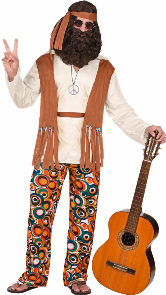 Hippies ovlivnili celý svět. Jejich styl oblékání je oblíbený dodnes. Nechte se inspirovat volností a barevností, které byly pro tuto dobu typické. Pánský hippies kostým s geometrickými vzory na kalhotách a hnědou vestou s třásněmi je vhodné na hippies párty.