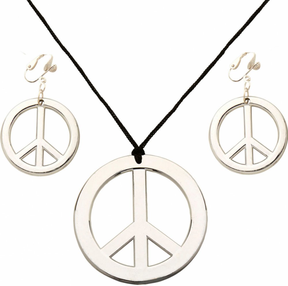 Pokud se chystáte na hippie uvolněnou party, pak určitě oceníte krásné doplňky. Jedná se o plastový náhrdelník na černé šňůrce a náušnice na klipsy, které mají typický symbol hippies stylu.