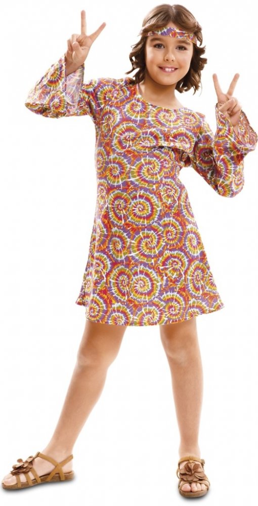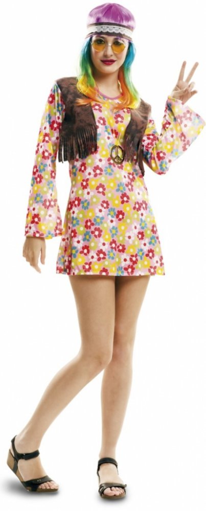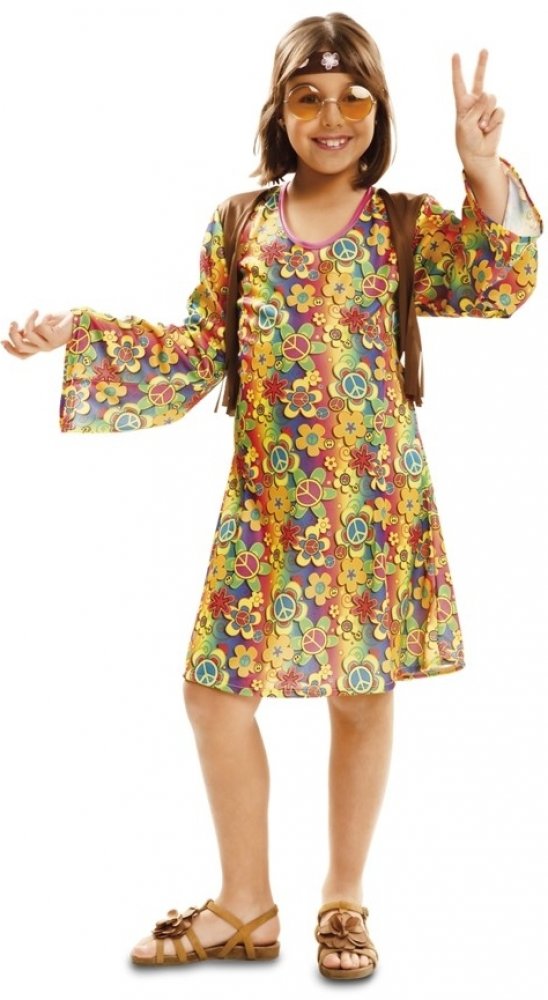 Duhové šaty s dlouhými rozšířenými rukávy jsou posety barevnými kytičkami a znaky hippie. Kolem krku je růžový lem. V přední části šatů je přišita hnědá krátká vestička s třásněmi na spodním lemu. Kostým doplňuje hnědá čelenka s květy.