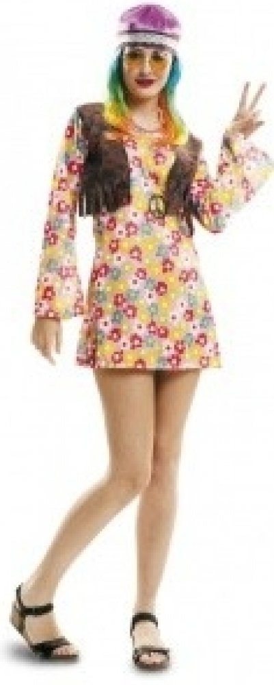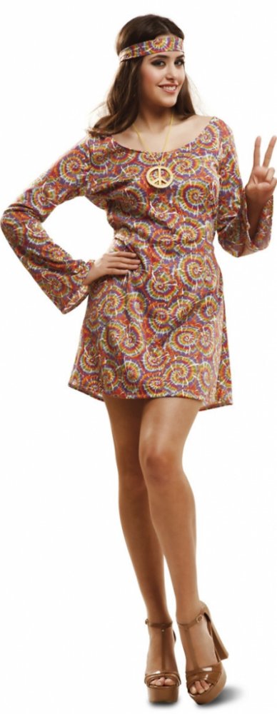Duhové šaty s dlouhými rozšířenými rukávy jsou posety barevnými šneky. Ze stejného matriálu je i čelenka.