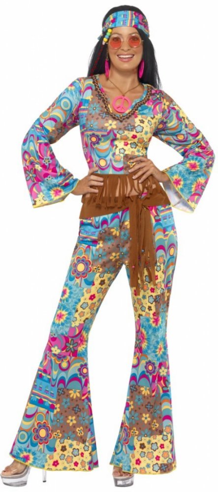 Dámský kostým hippiesačky obsahuje top, kalhoty, pásek a čelenku.