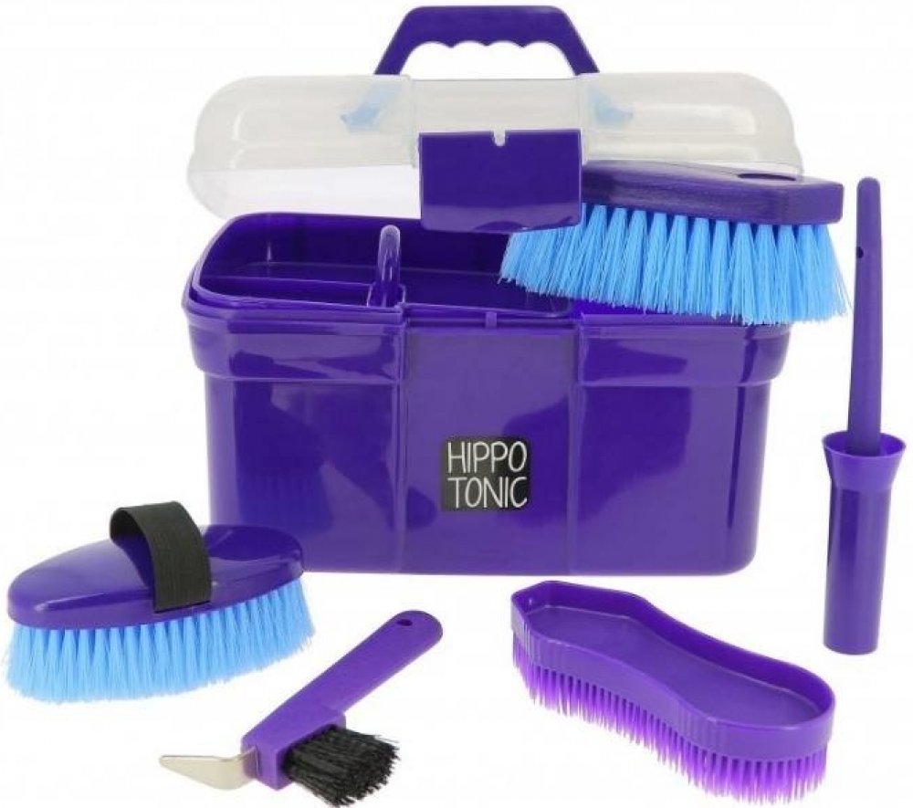 Malý vybavený čisticí box s průhledným víkem je praktickým pomocníkem pro péči o koně doma i na cestách. Uvnitř najdete vše potřebné pro každodenní čištění. Box obsahuje odnímatelnou přepážku, háček na kopyta, štětec na olej na kopyta s víčkem, víceúčelový kartáč, rýžový kartáč a kartáč na tělo z polypropylenu.