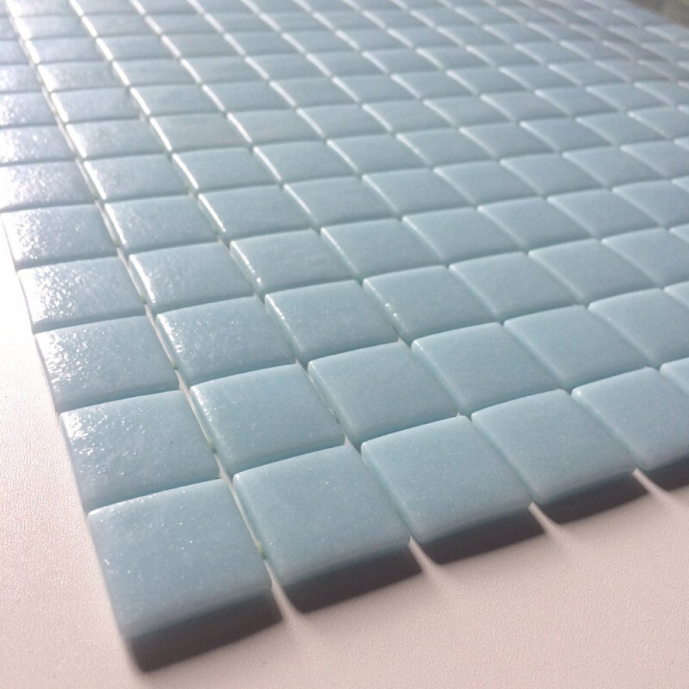 Skleněná mozaika modrá 25314ABH s protiskluzným povrchem a čtvercovým tvarem jednotlivých prvků mozaiky.Tato mozaika se vyrábí lisováním rozemletého tabulového skla do jednotlivých dílků. Technologie výroby je prakticky stejná jako u keramické mozaiky, proto má skleněná mozaika Hisbalit stejné nebo lepší technické parametry jako keramická.