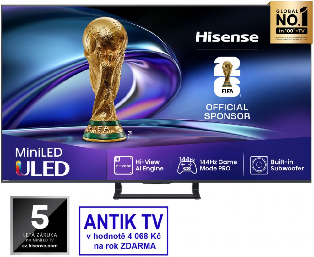 55" (139 cm) úhlopříčka s 4K UHD rozlišením, Hi-View AI Engine, Mini-LED Full Array displej s větší hustotou diod pro větší přesnost, vynikající kontrast a jasný, živý obraz, Dolby vision IQ, 144Hz variabilní obnovovací frekvence (VRR), Game Mode Pro, Dolby Vision.Atmos pro prostorový zvukový a obrazový zážitek, Vestavěný subwoofer, Široké možnosti připojení: 4× HDMI 2.1, USB 3.0, Bluetooth, Wi-Fi...