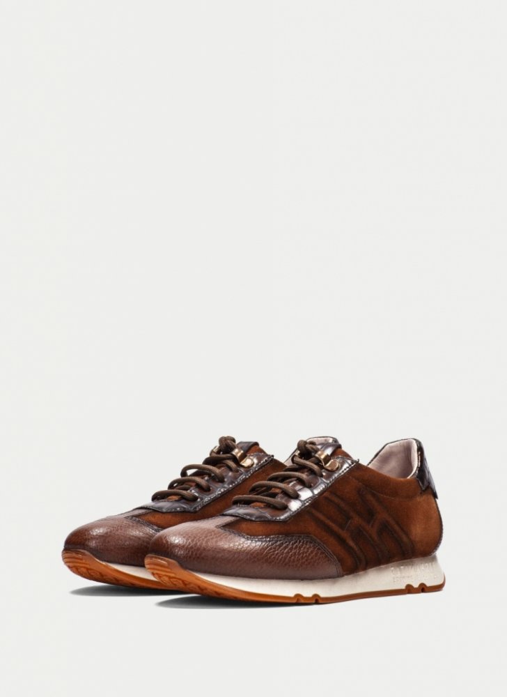 Kožená teniska v kombinaci hladké, broušené a kůže s vlisem kroko, je klasicky šněrovací, s koženou podšívkou i stélkou, která je i vyndavací.