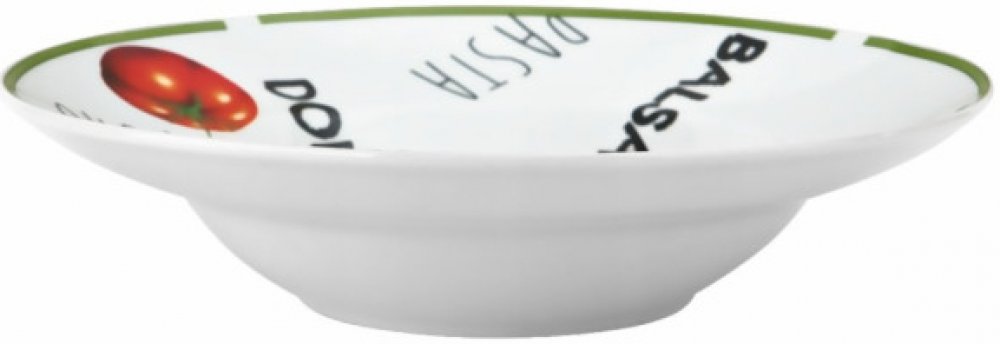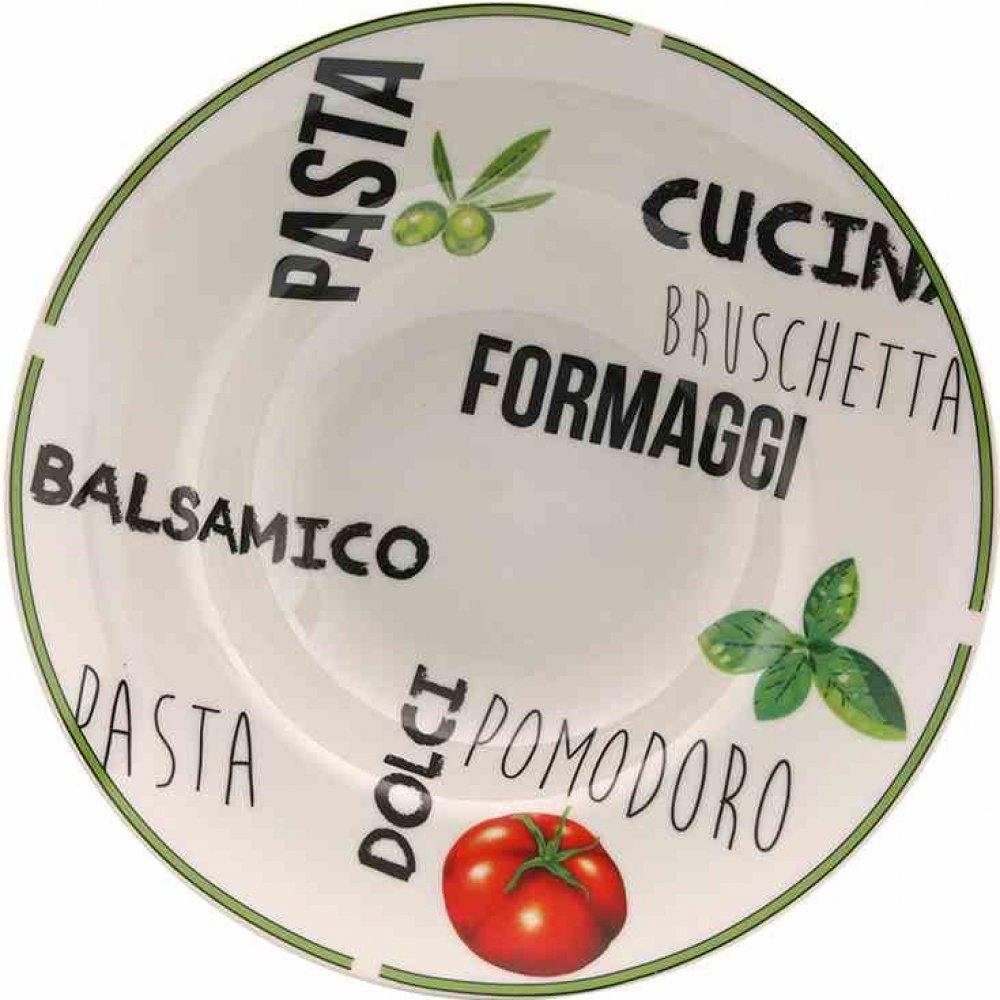 Zdobený talíř na pastu o průměru 27 cm. Zdobí ho rajče, bazalka, paprika, stejně jako zelené olivy a nápisy v italštině.Talíř má na okraji výrazný zelený proužek, který dokonale ladí s dekoracemi.Precizní zpracování, zaoblené tvary a smysl pro detail z něj dělají elegantní a pozoruhodný prvek vybavení nejen domácí kuchyně, ale i gastronomického provozu.- Výška: 8,3 cm- Průměr : 27 cm- Lze mýt v my...