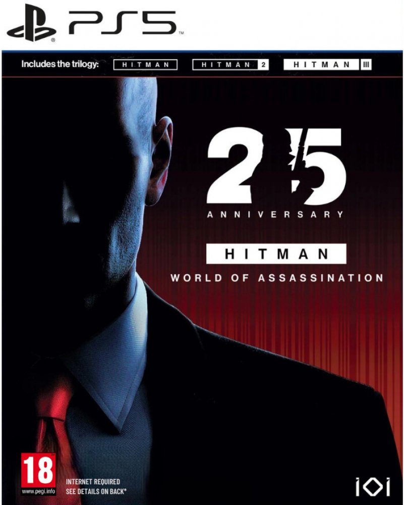 HITMAN World of Assassination krabička PS5 [grafika k 25. výročí]. Spojuje to nejlepší z her HITMAN, HITMAN 2 a HITMAN 3 včetně hlavní kampaně, režimu zakázek, eskalací, arkád s nepolapitelnými cíli a nového režimu Hitman: Freelancer.