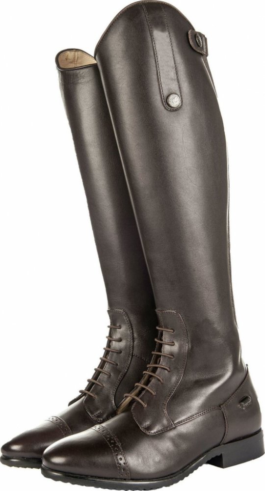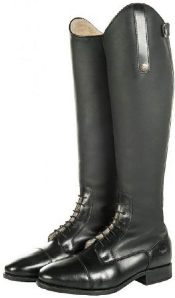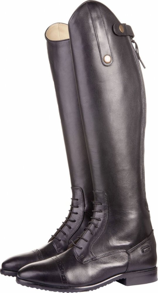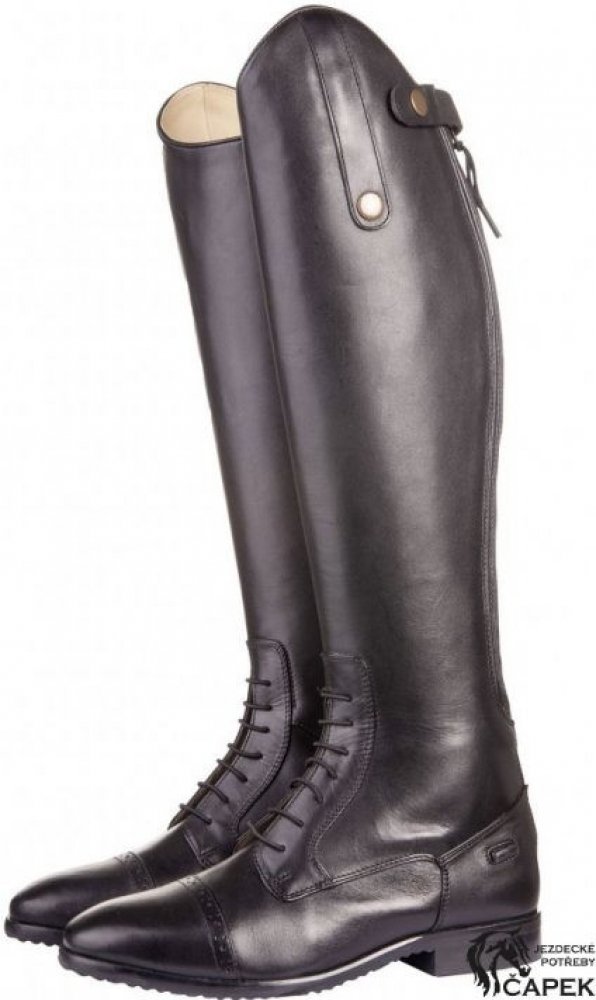 Vysoké jezdecké kožené boty s falešným šněrováním vpředu a zapínáním na zip vzadu na holeni. Po celé délce zipu jsou z obou stran elastické díly pro lepší přizpůsobení noze a větší pohodlí, nechybí zarážky na šporny a podrážka má přiměřenývzorek proti klouzání ve třmenu. Zip je nahoře jištěn drukem. Materiál kůže/PU v kombinaci s elastickou látkou. Barva černá. Velikosti skladem 37-41.