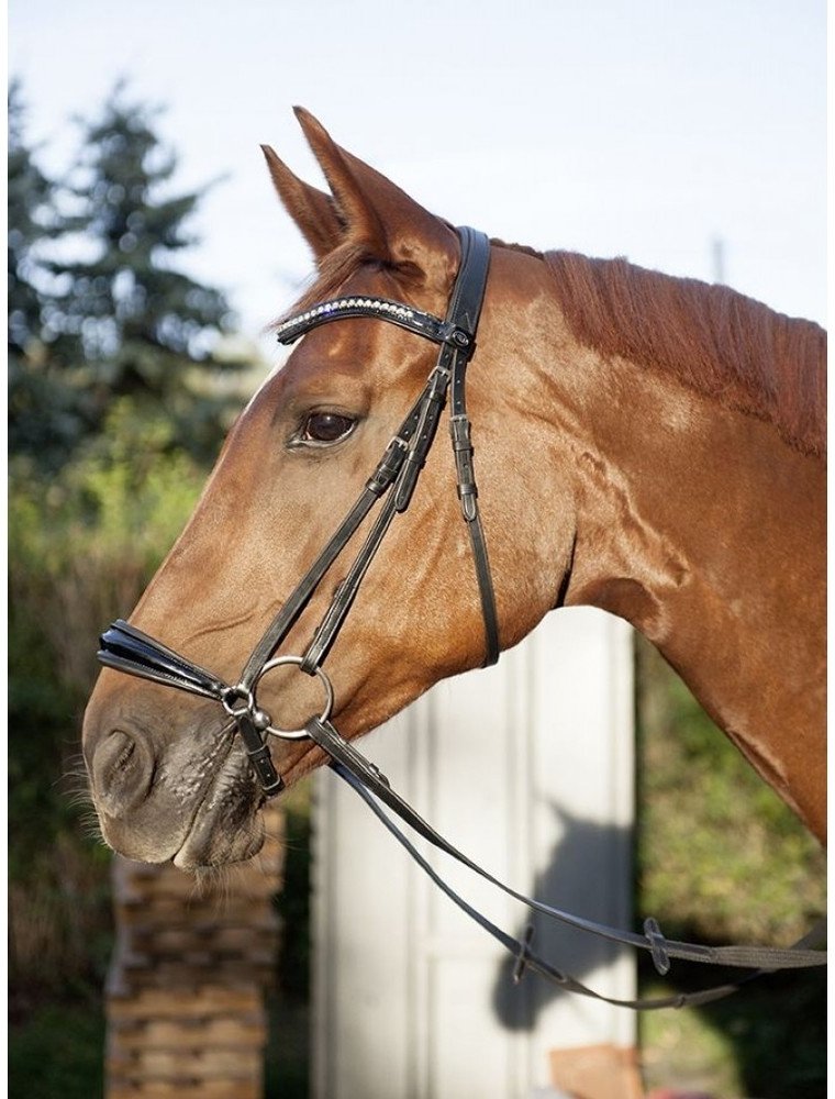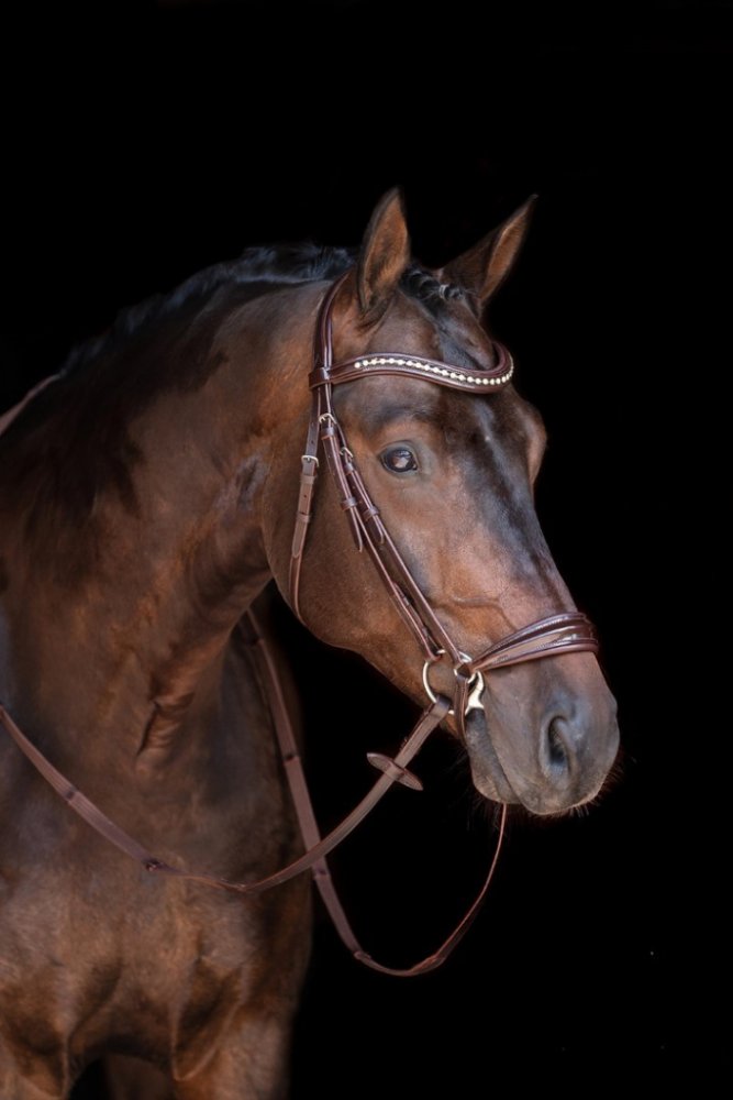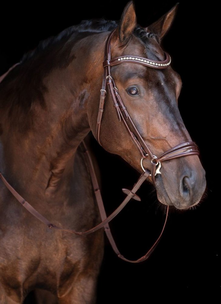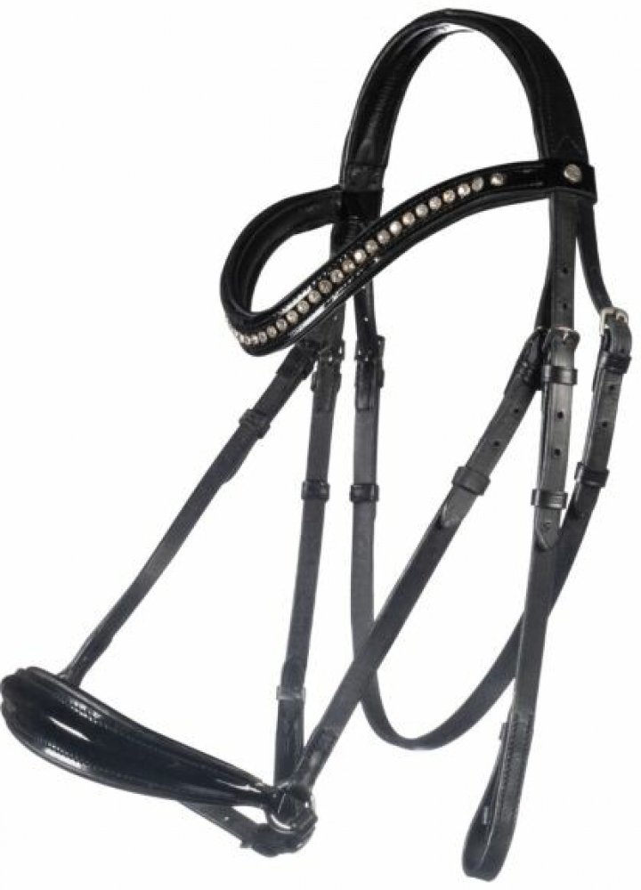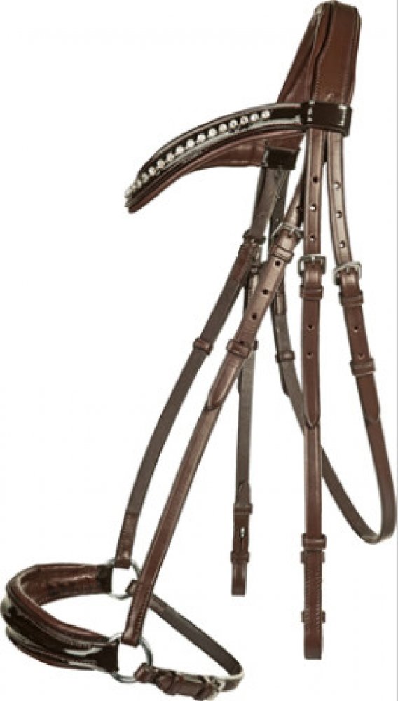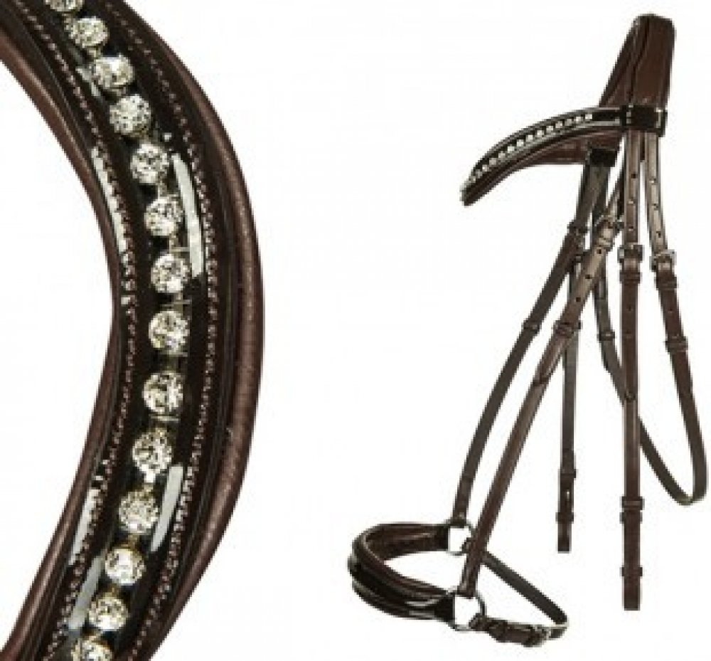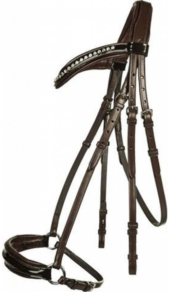 Vysoce kvalitní uzdečka s hannoverským nánosníkem vyrobená z hovězí kůže. Opatřena kováním ve stříbrné barvě. Nánosník, nátylník a čelenka měkce polstrované. Čelenka zdobena lesklými kamínky. Součástí jsou plátěné otěže s koženými zarážkami. Dostupná ve více barvách. Ve velikostech Pony, Cob a Full.