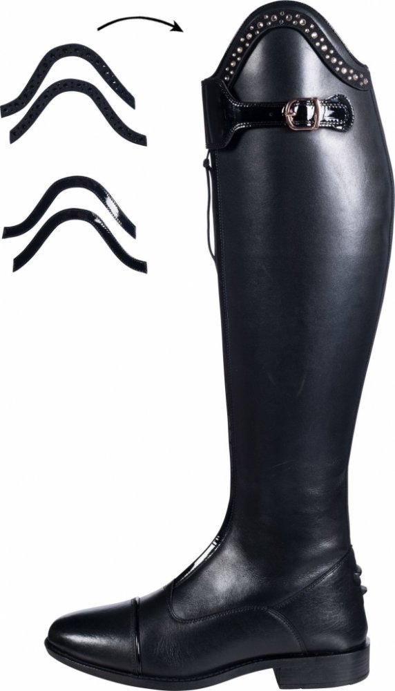 Vysoké kožené jezdecké boty značky HKM, zdobené kamínky, se zipem na přední straně.