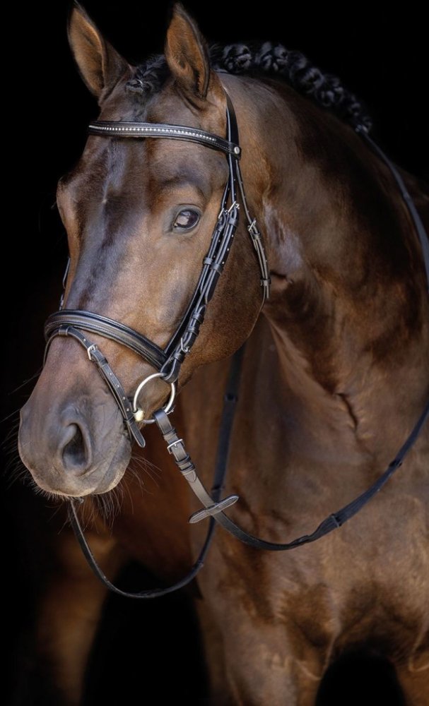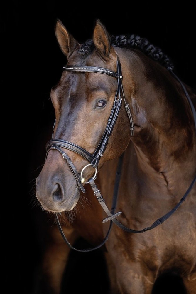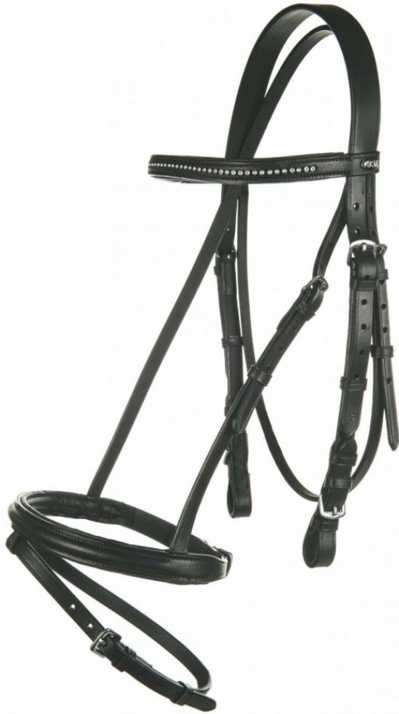 Kvalitní uzdečka s anglickým kombinovaným nánosníkem vyrobená z hovězí kůže. Opatřena kováním ve stříbrné barvě. Čelenka zdobena lesklými kamínky. Součástí jsou plátěné otěže s koženými zarážkami. Dostupná v černé barvě a velikostech Pony, Cob a Full.