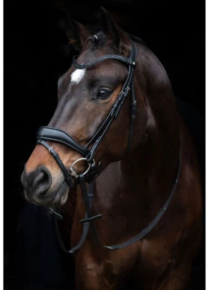 Kvalitní uzdečka s hannoverským nánosníkem vyrobená z telecí kůže. Měkké polstrování na nátylníku a nánosníku poskytuje koni maximální pohodlí. Anatomický nátylník poskytuje dostatek prostoru pro uši. Podhrdelník je nastavitelný z obou stran. Čelenku zdobí tmavé kamínky a lze ji pohodlně odepnout pomocí patentek. Dodávána s plátěnými otěžemi s koženými zarážkami. Ve velikostech Pony, Cob a Full.