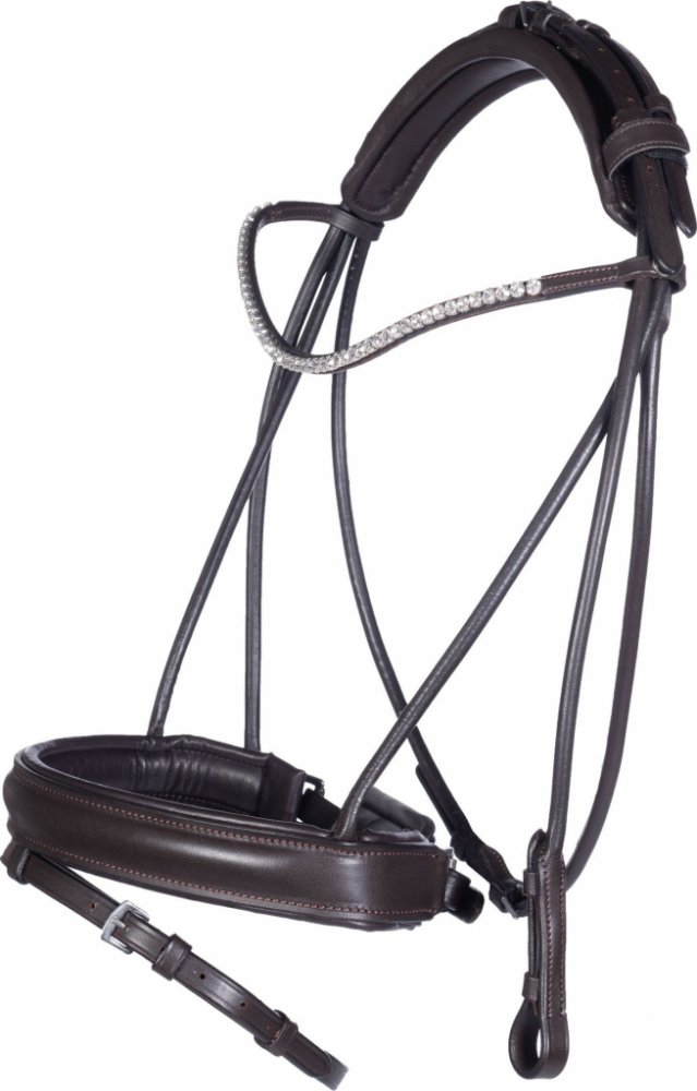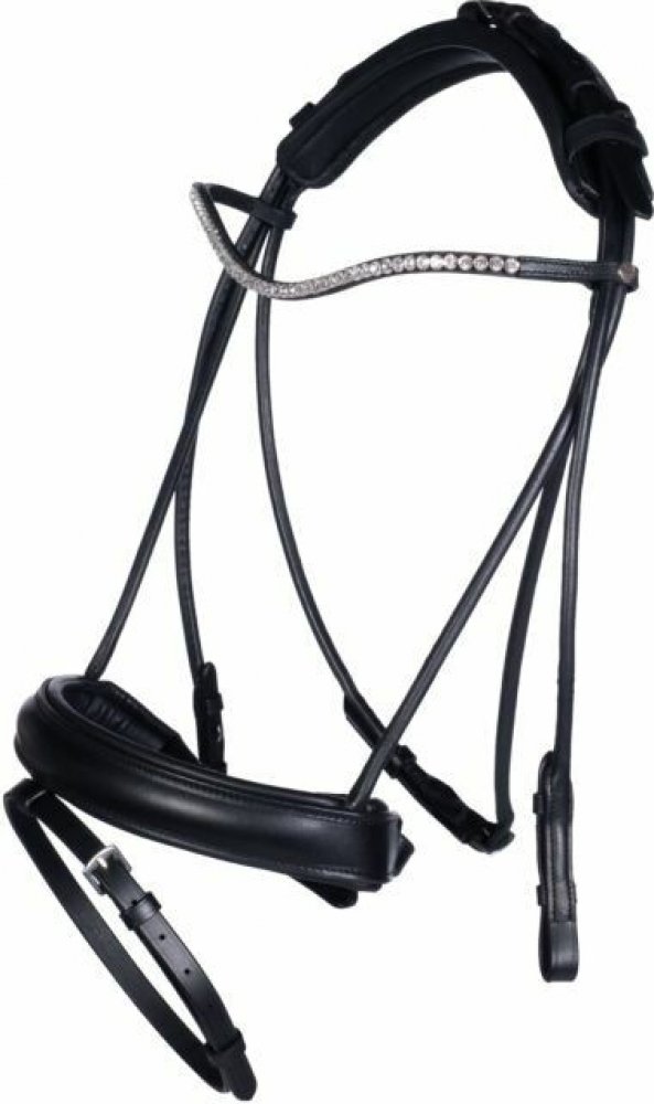 Kvalitní kožená polstrovaná uzdečka se švédským nánosníkem a ozdobnou čelenkou kamínky. Součástí uzdečky jsou plátěné otěže.