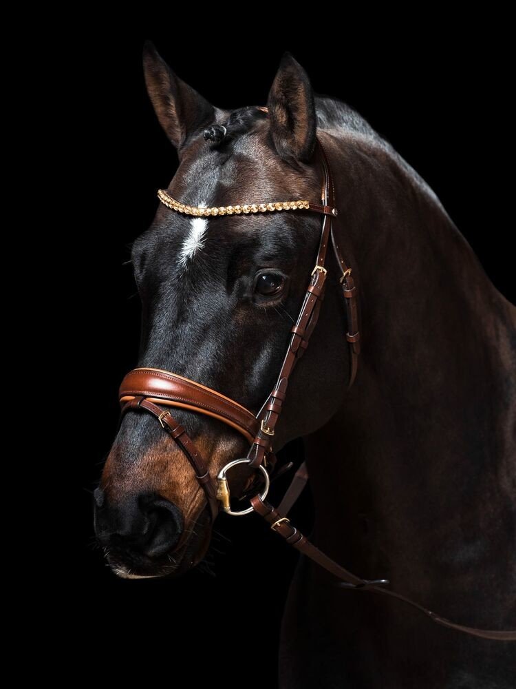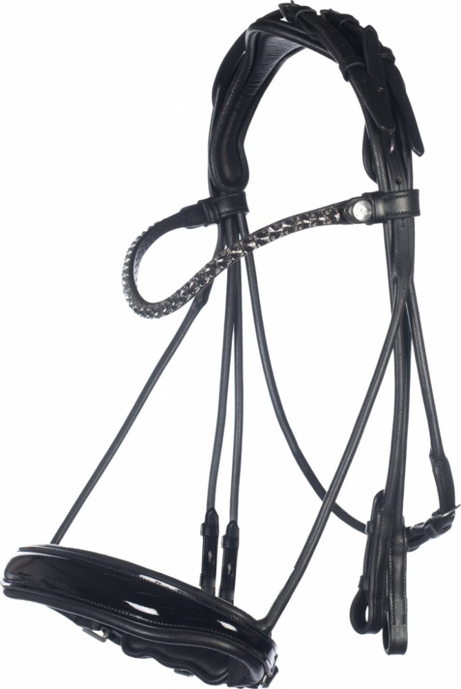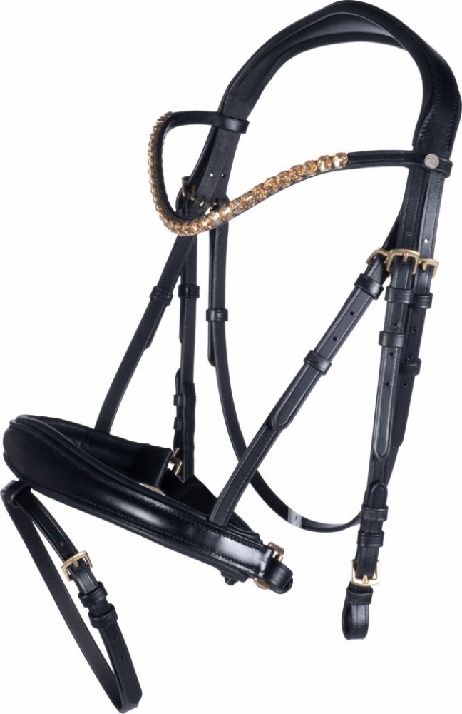 Vysoce kvalitní uzdečka se švédským kombinovaným nánosníkem vyrobená z kůže. Vybavena měkce polstrovaným nánosníkem a nátylníkem. Čelenka je zdobena lesklými zlatými kamínky. Opatřena mosazným kováním. Součástí jsou plátěné otěže s koženými zarážkami. Dostupná také v tmavě hnědé barvě. Ve velikostech Pony, Cob a Full.