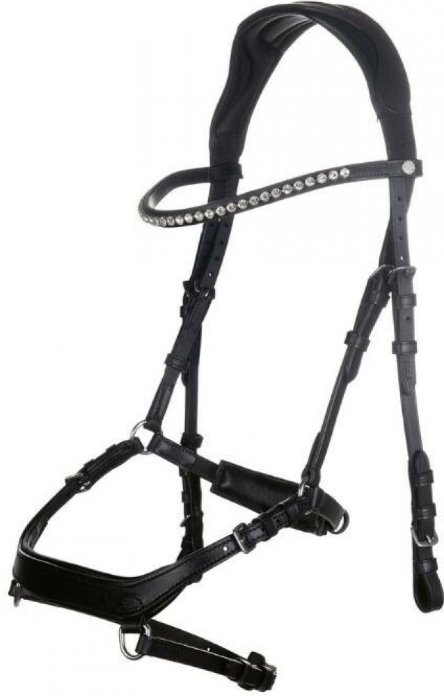 dodávána s popruhovými otěžemi s koženými zarážkami