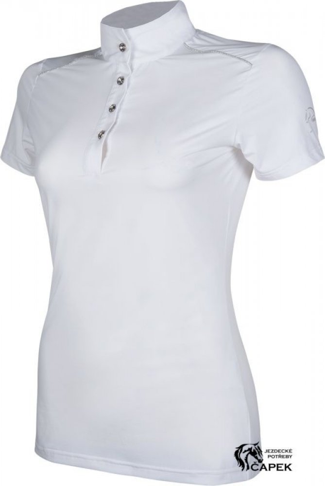 Jednobarevné závodní tričko zaujme jednoduchým designem a sportovní elegancí. vypasovaný střih pro ženskou siluetu lesklá knoflíková léga jako decentní akcent malé logo na rukávu ladící se stříbrnými detaily na ramenou prodyšný a elastický materiál – ideální pro závodní nasazení skvělé pohodlí i při náročném sportovním výkonu Zákazníci hledají také: tričko na závody s koňmi, parkurové tričko, závo...