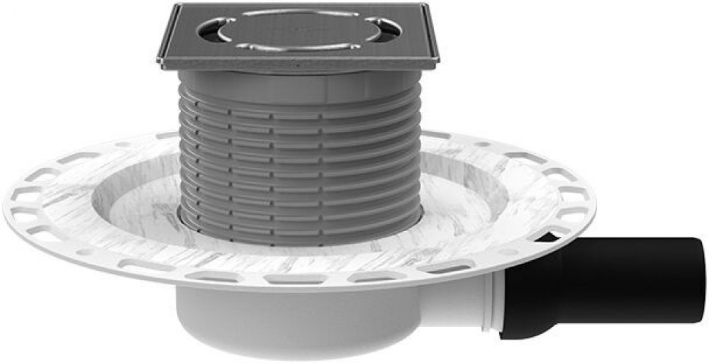 Podlahová vpust s vodorovným odtokem DN40, s nakašírovanou textilií na izolační přírubě, se zápachovým uzávěrem Primus blue - tzv. suchý sifon, nástavec Klick-Klack s rámem 121x121 mm s možností zkrácení 5-75 mm a vtokovou mřížkou 115x115 mm z nerezové oceli, pro tenkovrstvé skladby podlah, třída zatížení K3 - 300kg, stavební výška 69 mm, hydraulická kapacita 10 mm-0,40l/s, 20 mm-0,45l/s, materiál...