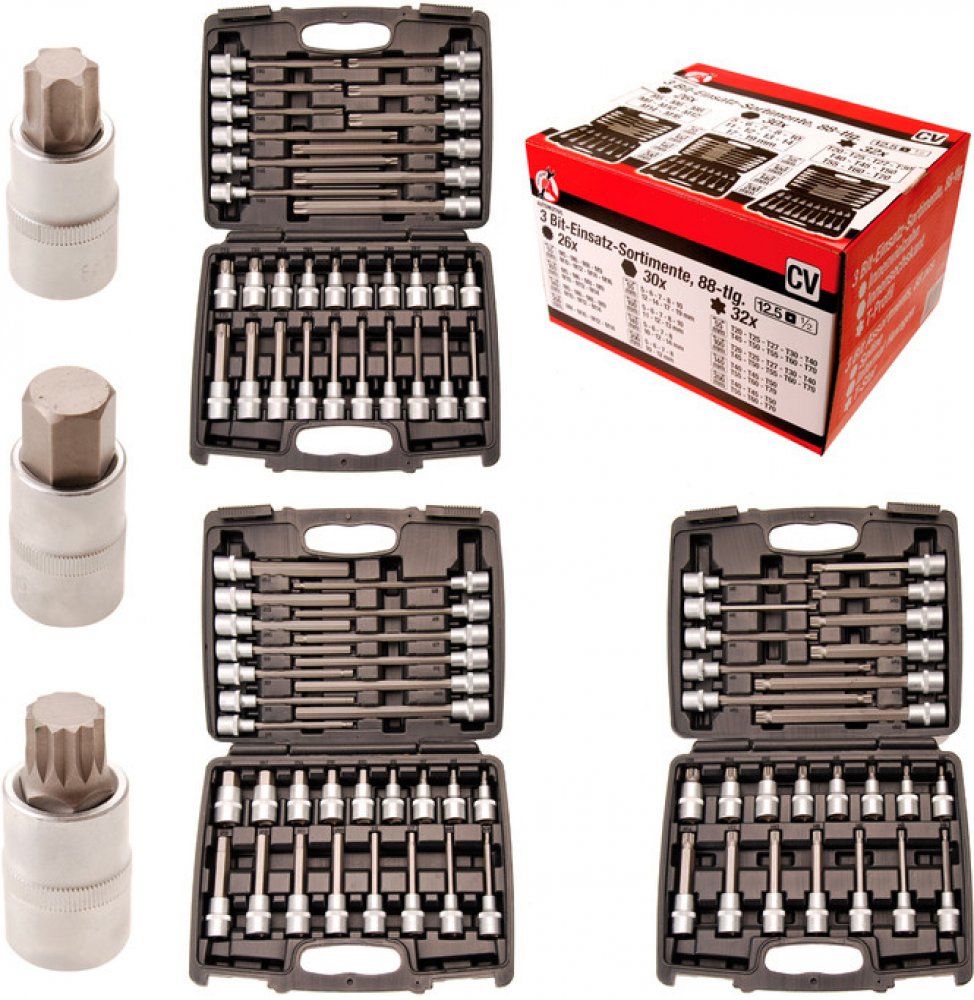 Rozsah dodávky: nástavce bitů, 55 mm, drážkování (pro XZN) M5 - M6 - M8 - M9- M10 - M12 - M14 - M16 nástavce bitů, 100 mm, drážkování (pro XZN) M5 - M6 - M8 - M9- M10 - M12 - M14 nástavce bitů, 140 mm, drážkování (pro XZN) M5 - M6 - M8 - M9- M10 - M12 - M14 bitové patice, 200 mm, drážkované (pro XZN) M8 - M10 - M12 - M14 bitové patice, 55 mm, vnitřní šestihran 5 - 6 - 7 - 8 - 10 - 12 - 14 - 17 - 19 mm nástavce bitů, 100 mm, vnitřní šestihran 5 - 6 - 7 - 8 - 10 - 11 - 12 - 13 mm nástavce bitů, 140 mm, vnitřní šestihran 5 - 6 - 7 - 8 - 10 - 12 - 14 mm nástavce bitů, 200 mm, vnitřní šestihran 5 - 6 - 7 - 8 - 10 - 12 mm nástavce bitů, 55 mm, T-Star (pro Torx) T20 - T25 - T27 - T30 - T40 - T45 - T50 - T55 - T60 - T70 nástavce bitů, 100 mm, T-Star (pro Torx) T20 - T25 - T27 - T30 - T40 - T45 - T50 - T55 - T60 - T70 nástavce bitů, 140 mm, T- Hvězdicové (pro Torx) T40 - T45 - T50 - T55 - T60 - T70 bitové patice, 200 mm, T-S dehet (pro Torx) T40 - T45 - T50 - T55 - T60 - T70