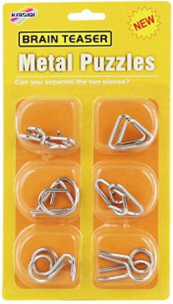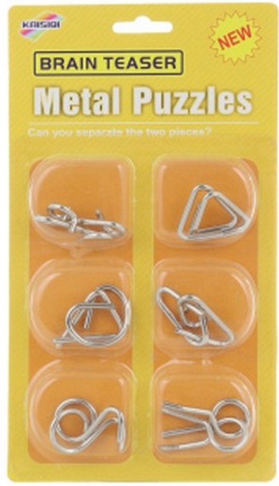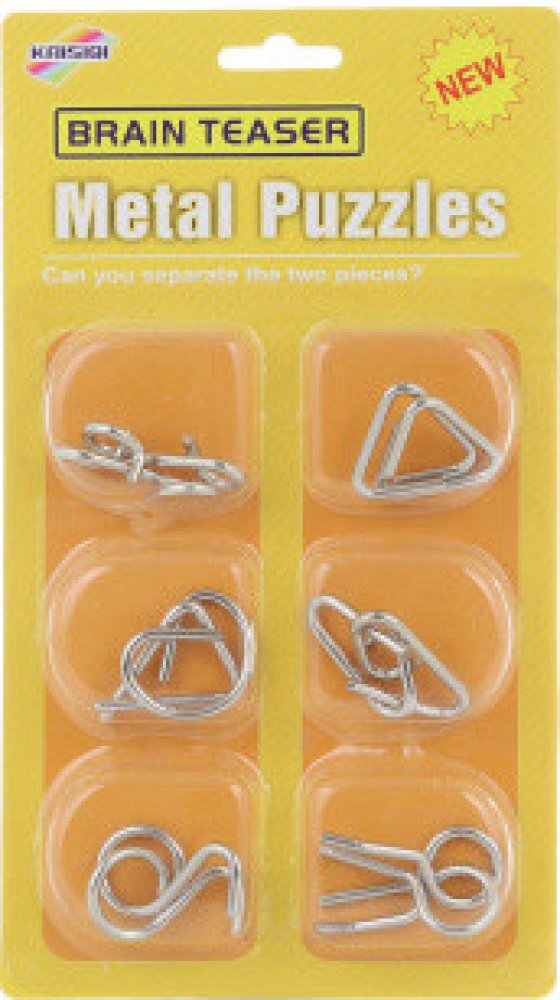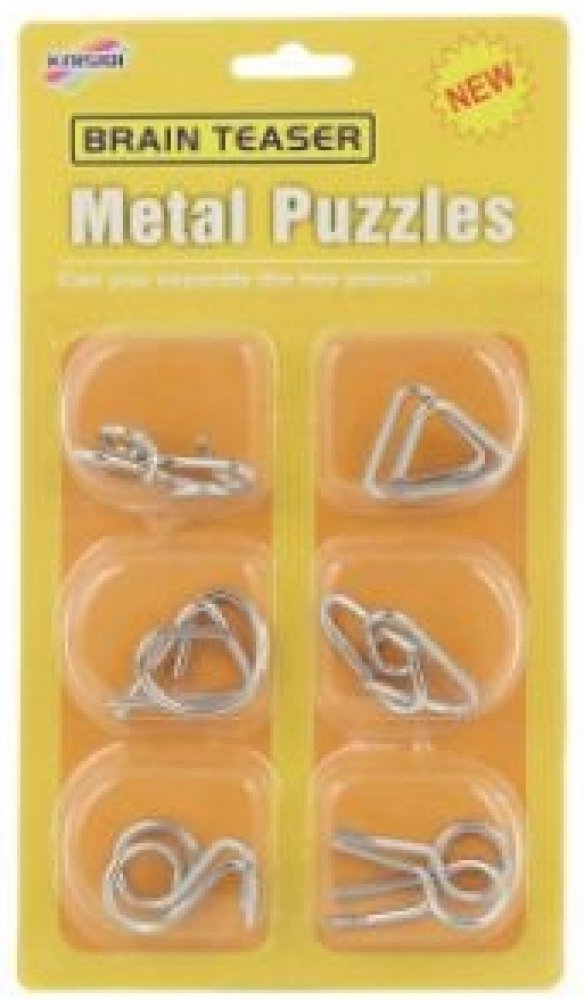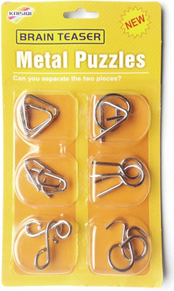 Malé kovové hlavolamy na kartě, sada celkem 6 kusů. Rozvíjí logické myšlení, prostorovou představivost a v neposlední řadě procvičí i motoriku prstů. Děti se u hlavolamů učí trpělivosti.