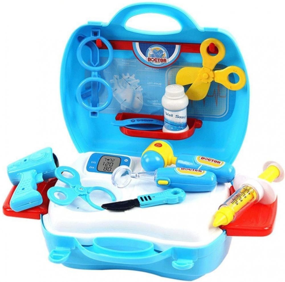 Rozkládací kufřík v modro bílém provedení vypadá jako sanitka. Po otevření nabízí dětem vybaví rozličné příslušentsví pro lékaře. Doplňky slouží i pro vyšetřování i ošetřování nemocných či zraněných pacientů.