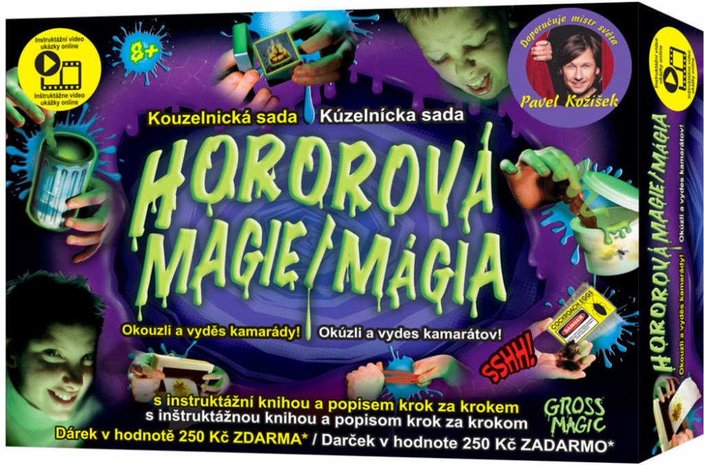 Sada Hororová magie vás zasvětí do světa těch nejodpornějších a nejděsivějších triků, na které si jen vzpomenete. Jedinečné variace kouzel jistě ocení jakékoliv publikum. Strašidelnými a zábavnými iluzemi oslníte nejen rodinu, ale i své kamarády a spolužáky. Zkoušet a objevovat hrůzostrašná kouzla mohou všechny holky i kluci starší šesti let. Díky promyšleným rekvizitám a skvěle propracovaným návo...