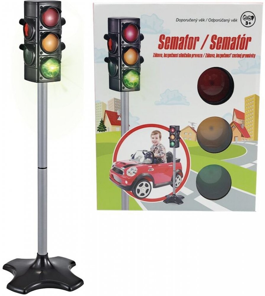 Plastová dopravní značka - semafor ideální nejen na dětské dopravní hřiště. Po sestavení je značka vysoká cca 72cm. 3xAA baterie. - Věk 3+.