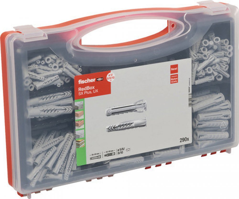 fischer BOX UX + SX Plus 290 ks ve velikostech 6, 8 a 10. Obsahuje: 60 x Rozpěrná hmoždinka SX Plus 6 x 30, 50 x Rozpěrná hmoždinka SX Plus 8 x 40, 20 x Rozpěrná hmoždinka SX Plus 10 x 50, 60 x Univerzální hmoždinka UX 6 x 35 R, 40 x Univerzální hmoždinka UX 6 x 50 R, 50 x Univerzální hmoždinka UX 8 x 50 R, 10 x Univerzální hmoždinka UX 10 x 60 R. Baleno v odolném plastovém organizéru.
