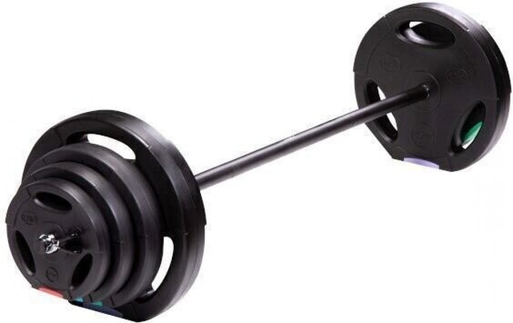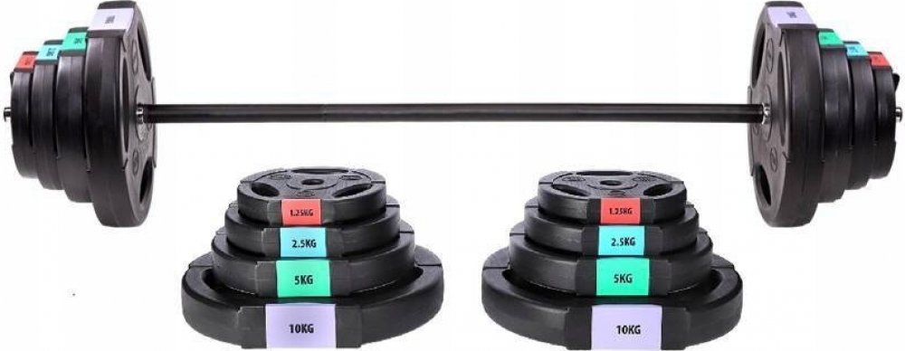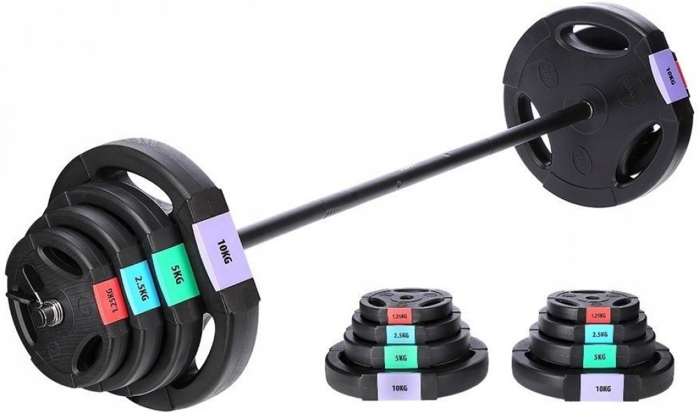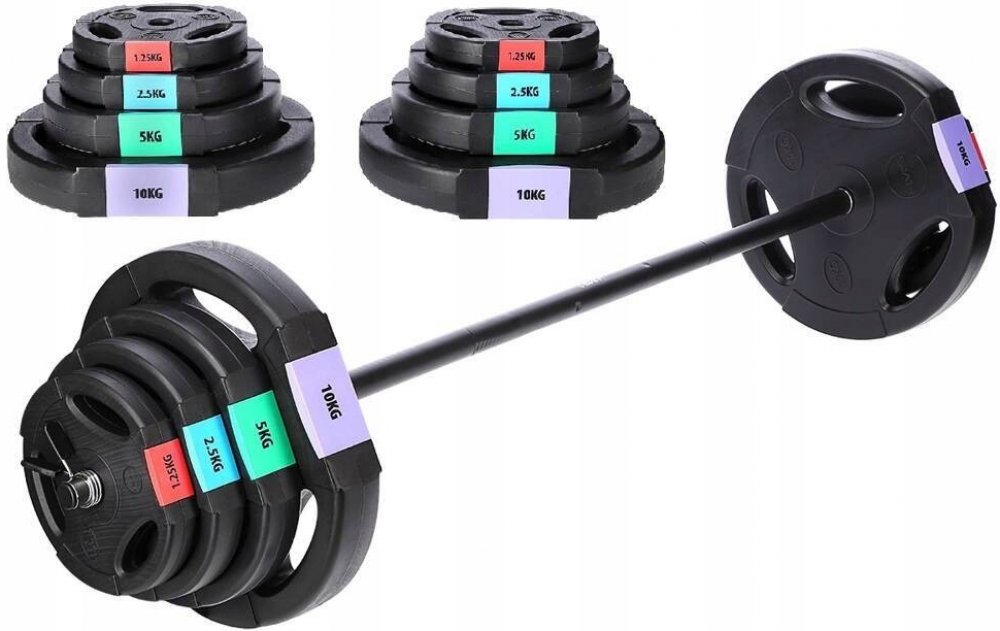 Kotouče jsou vyrobeny z trvdého plastu, který je vyplněn cementem. Obouruční osa je tvořena ze tří částí, které se do sebe skládají pomocí šroubení. Nakládací trny jsou hladké a závaží se zajišťuje pružinovými svorkami.