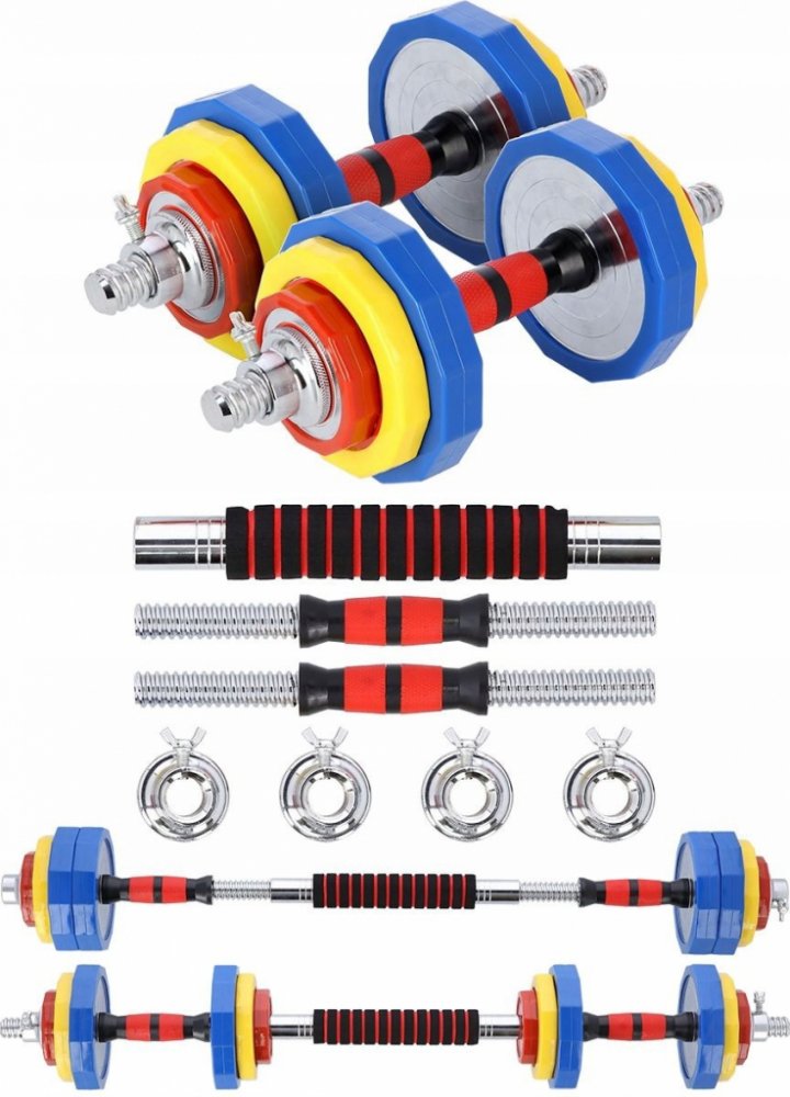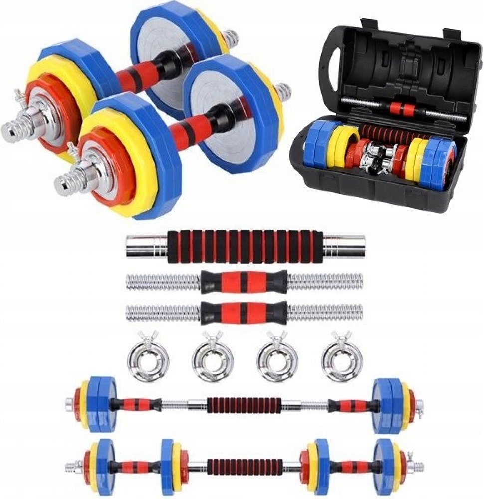 Sada obsahuje dvě tyče, čtyři svorky, spojovací dvě tyče a celkem 16 zátěžových desek. Vše je v pohodlném kufru.