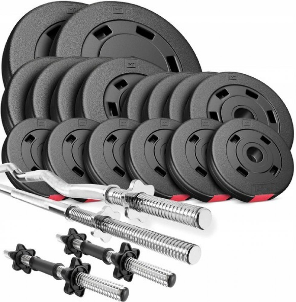 Kotouče jsou vyrobeny z trvdého plastu, který je vyplněn cementem. Obouruční osa je spojovacím dílem, do kterého se všroubují hřídele jednoručních činek. Nakládací trny jsou opatřeny závitem a závaží se zajišťuje pomocí hvězdicových matic. Šestihranný tvar kotoučů navíc zamezuje jejich odvalování. Činky se Vám tak nikam neodkutálí a budete je mít vždy tam, kde jste je odložily.