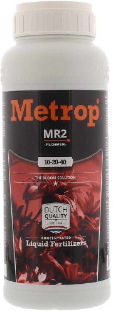 U Metrop MR2 biominerálního hnojiva pro květ je poměr N-P-K a množství stopových prvku nastaveno na maximální výnos rostlin. Základní látky pro Metrop MR2 jsou obzvláště čisté, čímž se zvýší podíly N-P-K, aniž by docházelo k poškození rostlin. Díky kvalitě těchto látek nedochází k usazeninám ani v nádobách, ani v zavlažovacím systému. Po rozpuštění ve vodě zůstává hodnota EC konstantní. Zároveň i přidané stopové prvky jsou ve vyšší koncentraci a ve velmi čisté formě, čímž fotosyntéza rostlin probíhá lépe a rychleji, což se příznivě projeví na kvalitě konečného produktu. Metrop MR2 biologické hnojivo pro květ je vysoce kvalitní rostlinný extrakt obsahující všechny makro a mikro složky potřebné pro zdravý vývoj květu v jakémkoliv pěstebním mediu. Určeno k optimálnímu rozvoji květu; Zajišťuje dostatečný přísun dusíku (dovršení růstu vrcholu); Zajišťuje dostatečný přísun fosforu (rozvoj kořenů); Zajišťuje dostatečný přísun hořčíku (optimální průběh fotosyntézy a syntézy proteinu); Neobsahuje škodlivá barviva, není ředěné vodou. Skládá se pouze z nejčistších materiálu a proto udržujte nízkou hodnotu EC; neobsahuje těžké kovy. Skladujte mimo dosah dětí. Použití: Od třetího až čtvrtého týdne květu. V závislosti na velikosti květu zvyšujte plynule koncentraci. Poslední týden proplachujte dle potřeby. Při pěstování v zemních substrátech bohatých na živiny používejte roztok jednou až třikrát týdne. V případe hydroponie používejte denně. Kontrolujte hodnotu EC. Nepřehnojte! Skladujte na temném místě, uchovejte před mrazem. Při zasažení očí vypláchnete ihned vodou. Před použitím protřepte! HNOJIVO-ES, složitá suspenze NPK hnojiva 10-20-40 se stopovými prvky: skupni dušik (N) 10.00% - dusičnanový dusík (N) 9.33% - amonného dusíku (N) 0.67% - fosfati (P) rozpustné ve vodĕ 20.00% - kalij (K) rozpustné ve vodĕ 40.00% - Magnesijev (Mg) rozpustné ve vodĕ 1.50% - železo (Fe) rozpustné ve vodĕ, chelatační činidlo EDTA 0.175% - mangan (Mn) rozpustné ve vodĕ, chelatační činidlo EDTA 0.088% - baker (Cu) rozpustné ve vodĕ, chelatační činidlo EDTA 0.088% - cink (Zn) rozpustné ve vodĕ, chelatační činidlo EDTA 0.088% - bor (B) rozpustné ve vodĕ 0.035% - kobalt (Co) rozpustné ve vodĕ, chelatační činidlo EDTA 0.0011% - molibden (Mo) rozpustné ve vodĕ 0.0012%.