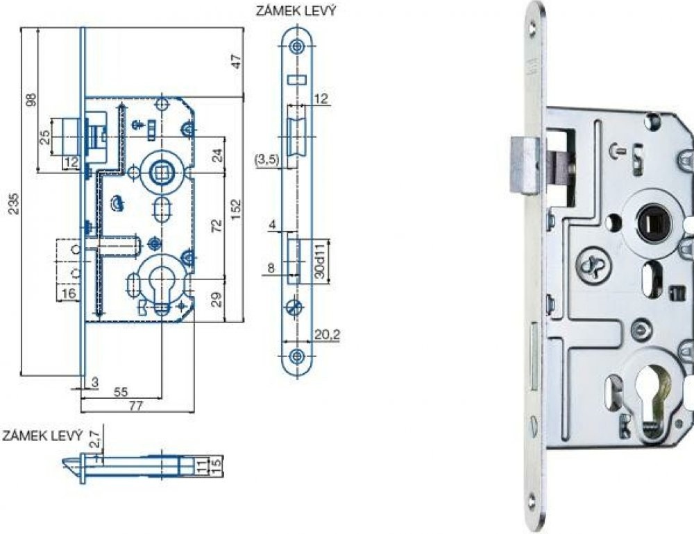 Zámek je určen pro cylindrickou vložku a standardní dveřní kování. Povrchová úprava BÍ Zn (bíle pozinkováno) zajišťuje odolnost proti korozi a dlouhou životnost. Provádění P (pravé dveře) je určeno pro montáž do levě otevírajících dveří.