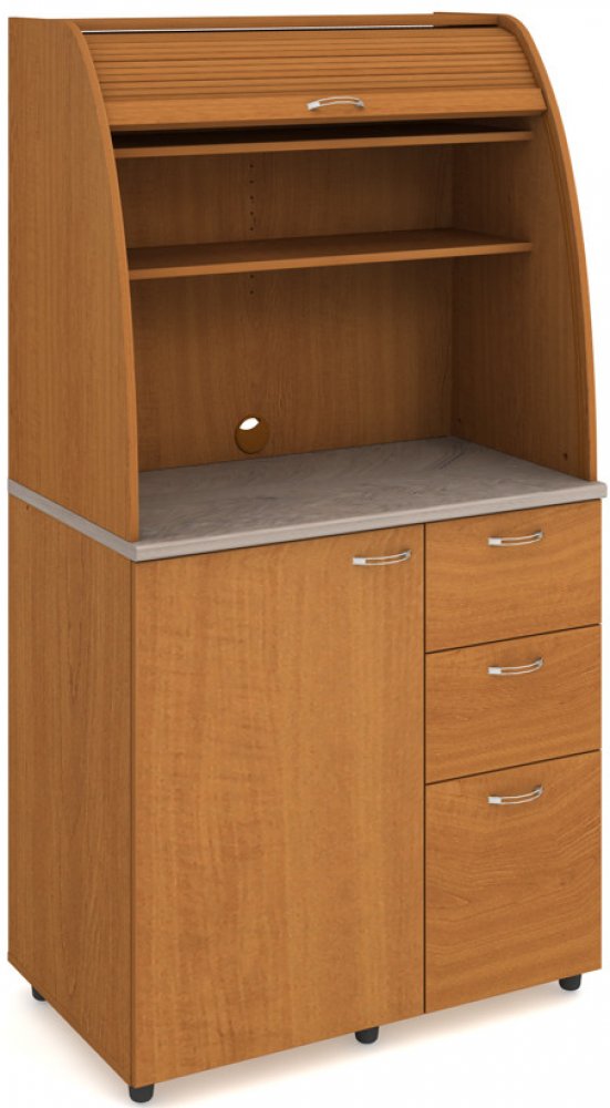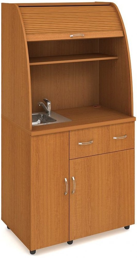 Minikuchyňky HOBIS lze skvěle kombinovat s veškerým kancelářským nábytkem tohoto výrobce. Je možno si vybrat model s vestavěnou lednicí či dřezem. Tři zásuvky ve spodní části kuchyňky zajistí dostatečné místo pro příbory či pro Vaše oblíbené pochutiny. Do velkoprostorové zásuvky u země se pohodlně vejde i objemnější nádobí. Dvě horní police pak poslouží pro uložení hrnků na kávu a další drobné nád...